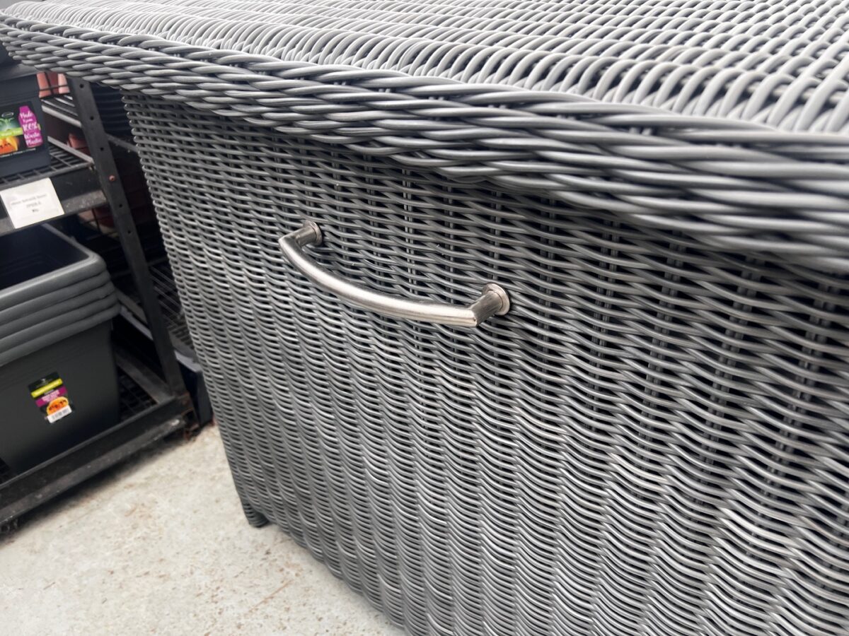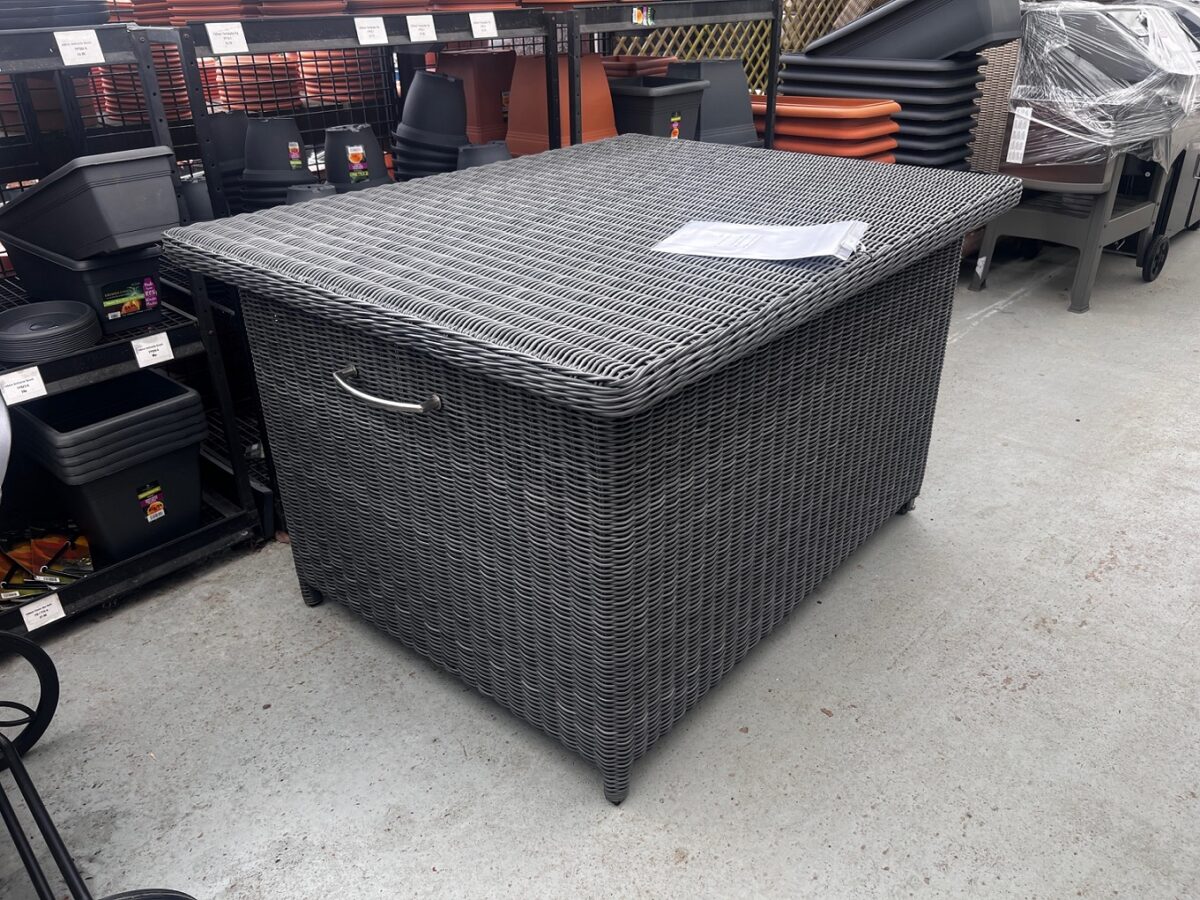 This 4 Seasons Outdoor Wales Cushion Box in Polyloom – Charcoal has a strong aluminium frame which is covered with a single Hularo weave. The outdoor resin weave is durable and weather-resistant whilst being very realistic-looking. It is a generous size, with a hinged lid, side handles and two wheels, making it easier to move around.