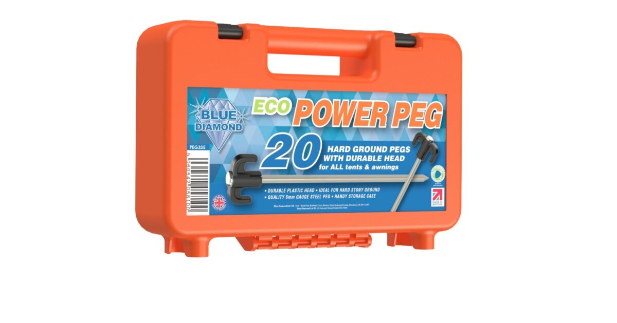 The Blue Diamond Eco Power Peg is a tent & awning peg ideal for hard or stony ground. Manufactured in the UK from quality 6mm gauge steel and plastic which is responsibly sourced from recycled materials for the peg heads. The handy plastic storage case contains 20 Power Pegs.