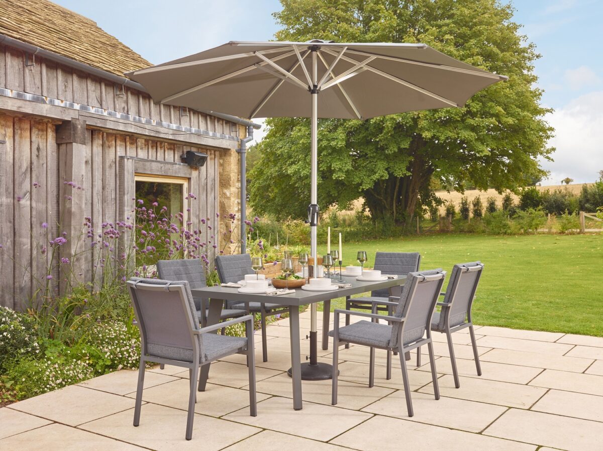With its dark, smouldering good looks, this set features lightweight aluminium chairs in Anthracite with removable chair cushions in our smart Slate season-proof Eco fabric. Made from fabric spun from recycled plastic bottles, our quality Eco fabric is hard wearing and UV resistant. The highly durable yet low maintenance table top is made from ceramic glass. A grey parasol and base complete the set. This set would look perfect in any outdoor spaces, it would also be an excellent option for a conservatory or even round a pool!