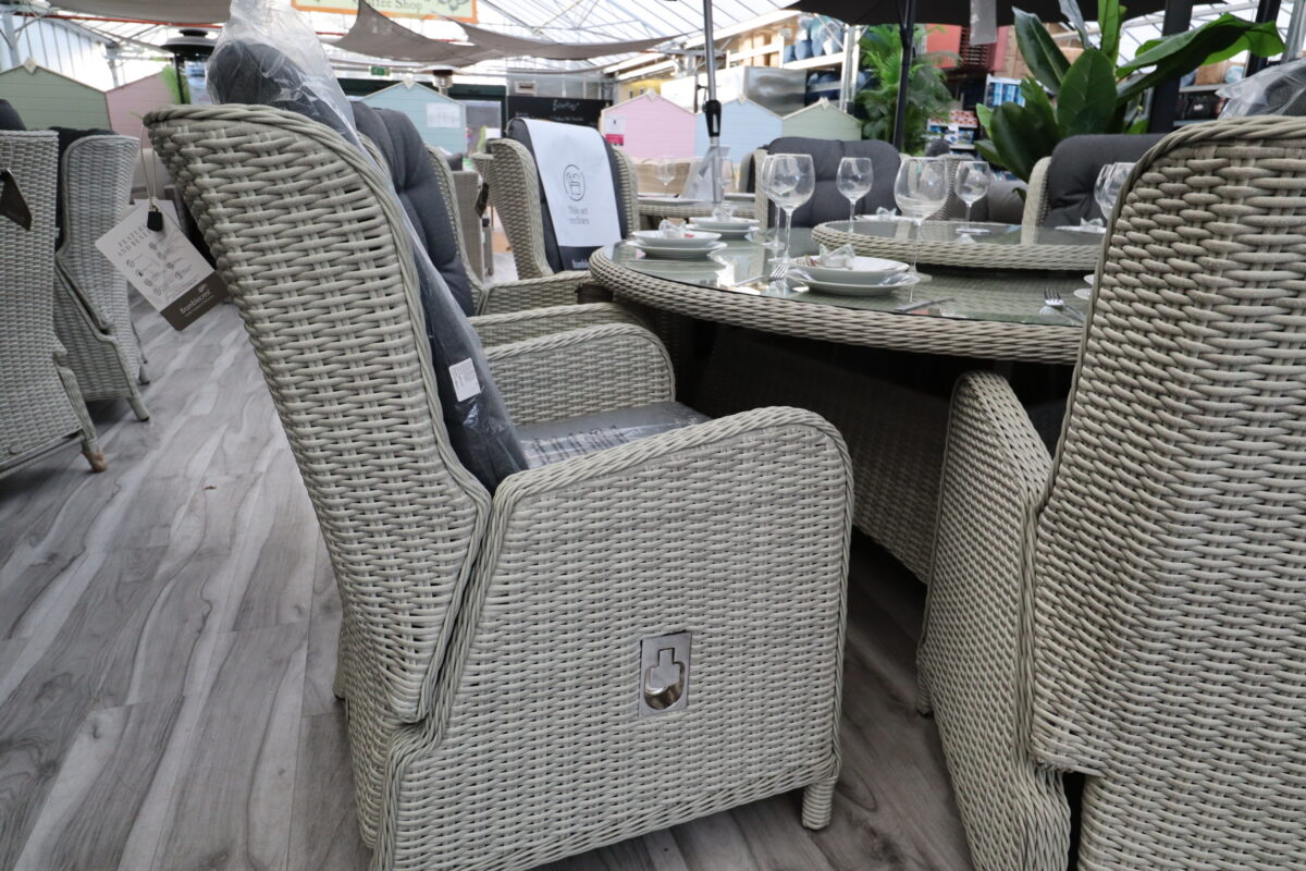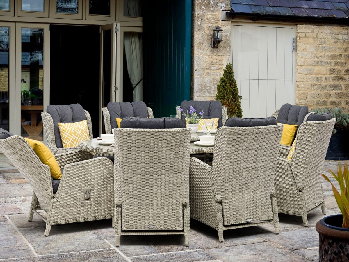Guests can be seated in style and comfort on reclining high-back armchairs, complete with season-proof cushions in a tasteful Herringbone Dusk fabric.
