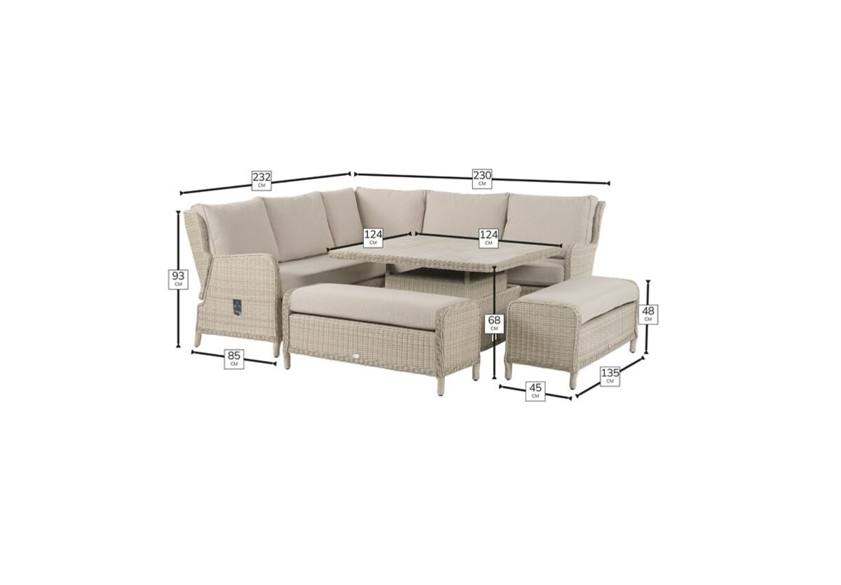 – Dimensions (cm). Sofa: H93 x W/D85 x L230 x 232, Table: H68 x W/D122 x L122, Bench: H48 x W/D45 x L115