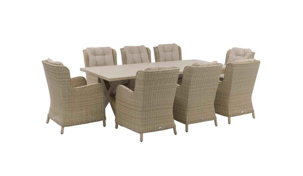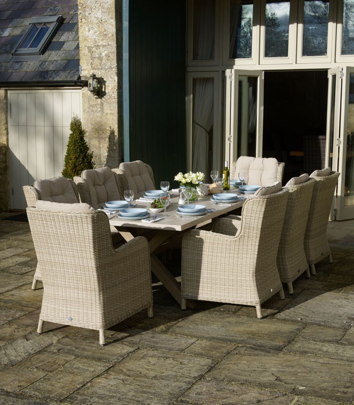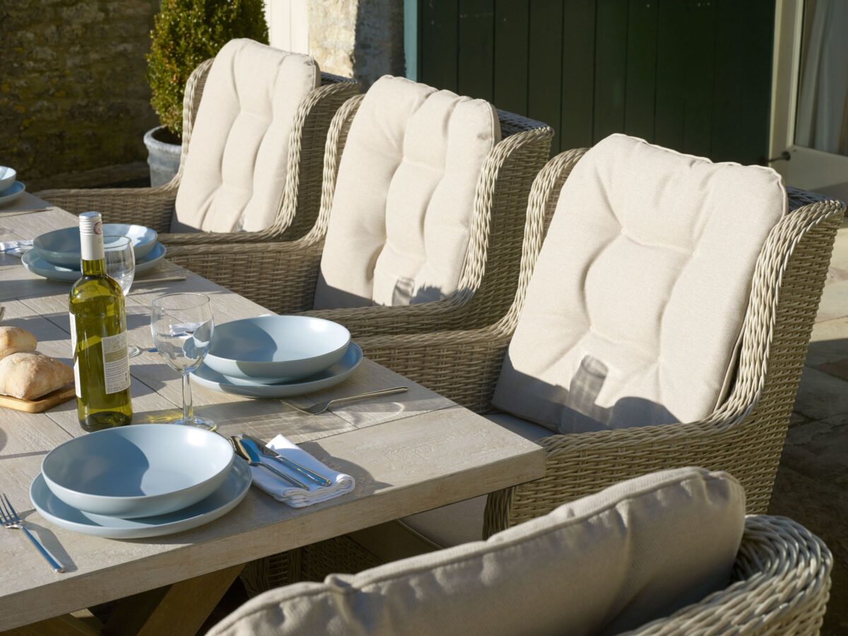 High in style but low in maintenance, this eight seat dining set boasts a ceramic wood-effect refectory table and sublime high-back armchairs. Guests can be seated in style and comfort on the Sandstone outdoor rattan dining chairs, complete with season-proof cushions in a tasteful Herringbone Barley fabric. The natural tones of this set complement any surrounding – indoors or out.