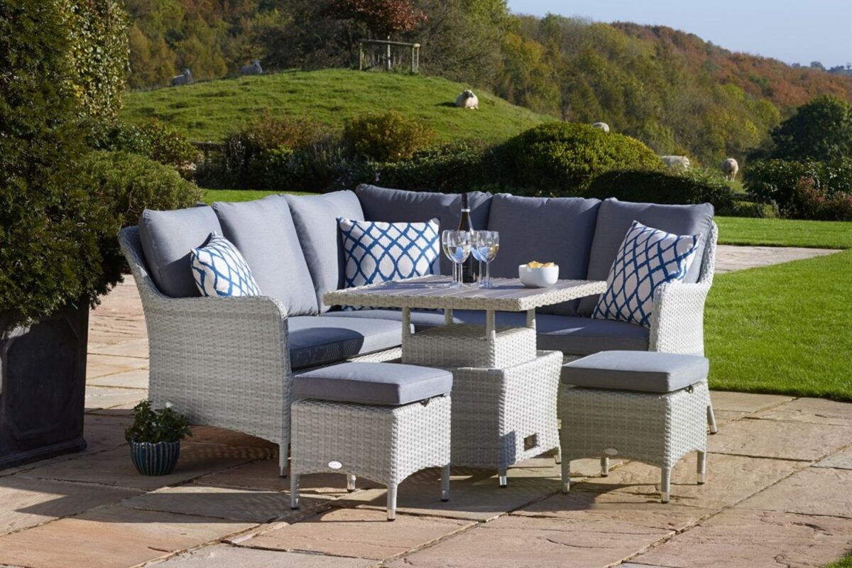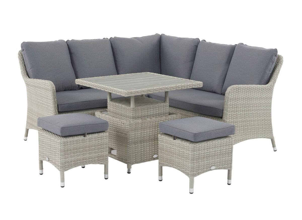 Small but perfectly formed, this Bramblecrest Tetbury Mini Corner Set with Hi/Lo Table set provides the ultimate in social dining for small gatherings. With good looks and practicality in mind, the height-changing table offers versatility to your entertaining options – coffee table by day, dining table by night.