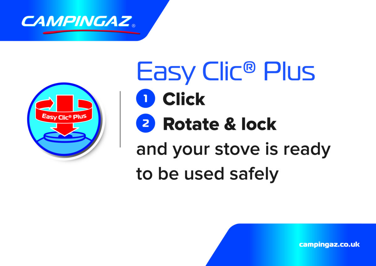 Campingaz® valve cartridge with high-performance butane/propane mix. For use with Campingaz Easy Clic® Plus appliances this cartridge has a self-sealing safety valve – simply push and turn the device onto the cartridge until you hear a click for a secure and tight connection. The cartridge can be removed and re-attached, even if not yet empty – an ideal solution if you need to operate multiple devices or transport your cartridge between uses.