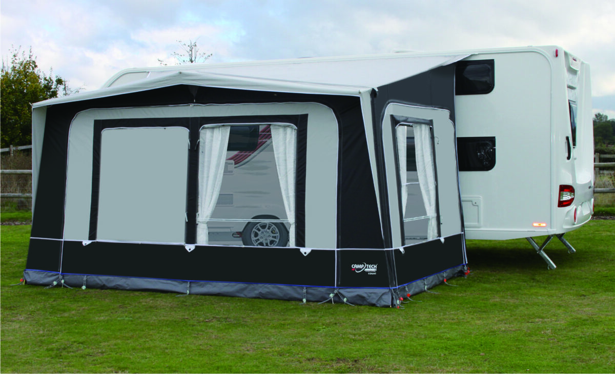 The Camptech Count DL is a luxury caravan porch awning which has the versatility and qualities of Camptech traditional all-season awnings. It is the ideal choice for someone looking for an easy to erect porch awning with plenty of internal space and bags of quality features. Large windows all around the awning make the internal space light and airy, with superb headroom throughout. Pitching is extremely easy using super-strong steel framework. Simply slide the awning onto your awning rail, clip the internal frame together – then peg the awning our to complete your new home from home.