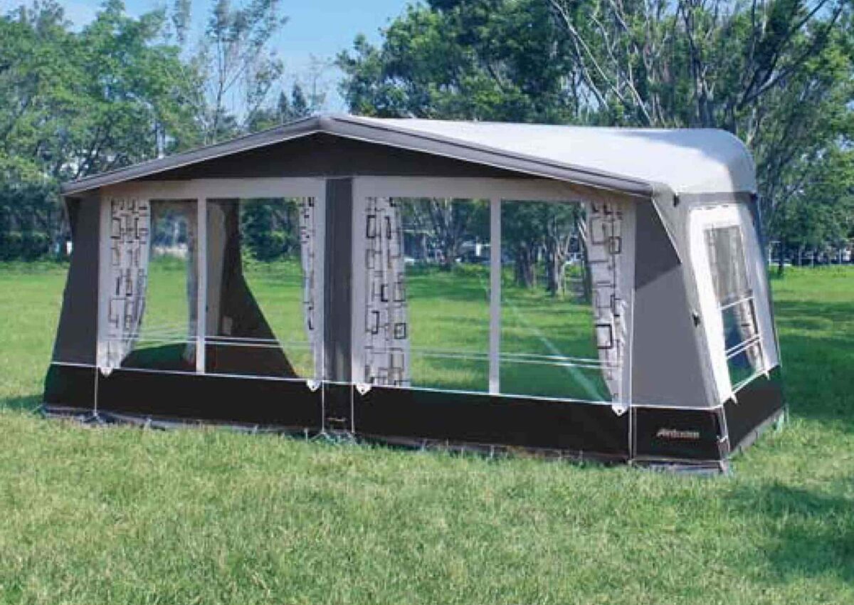 The Kensington inflatable seasonal awning has the design and space of a traditional awning, yet the convenience and speed of an air awning. Why compromise when you can have the best of both styles? The four large windows not only make the awning light and spacious, they can also be rolled back to make four exceptional-sized front doors to accommodate all your practical needs for your day-to-day holiday, no matter how big or small your family may be! This function is also in compliance with disability requirements.