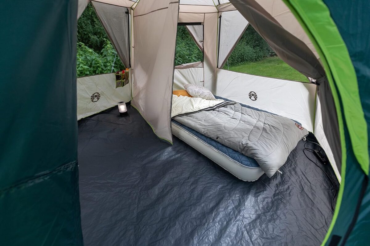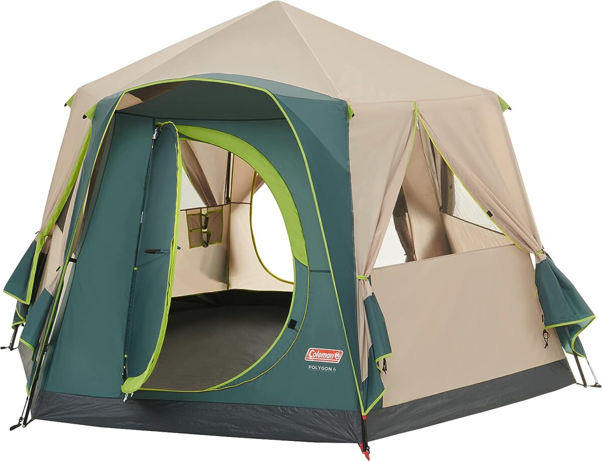 The side walls of the Coleman Polygon 6 Tent can be rolled back, offering a full 360° view of your surroundings. Featuring the ingenious hinged door for convenience, opening the sides allows lots of air and light into the tent. There are 2 doors, one being the patented Coleman Hinged Door, and an electric-cable port for convenience. The flysheet can be removed and the tent transforms into a bug-proof screen room, perfect for the garden or for festivals.