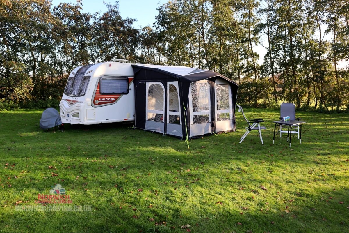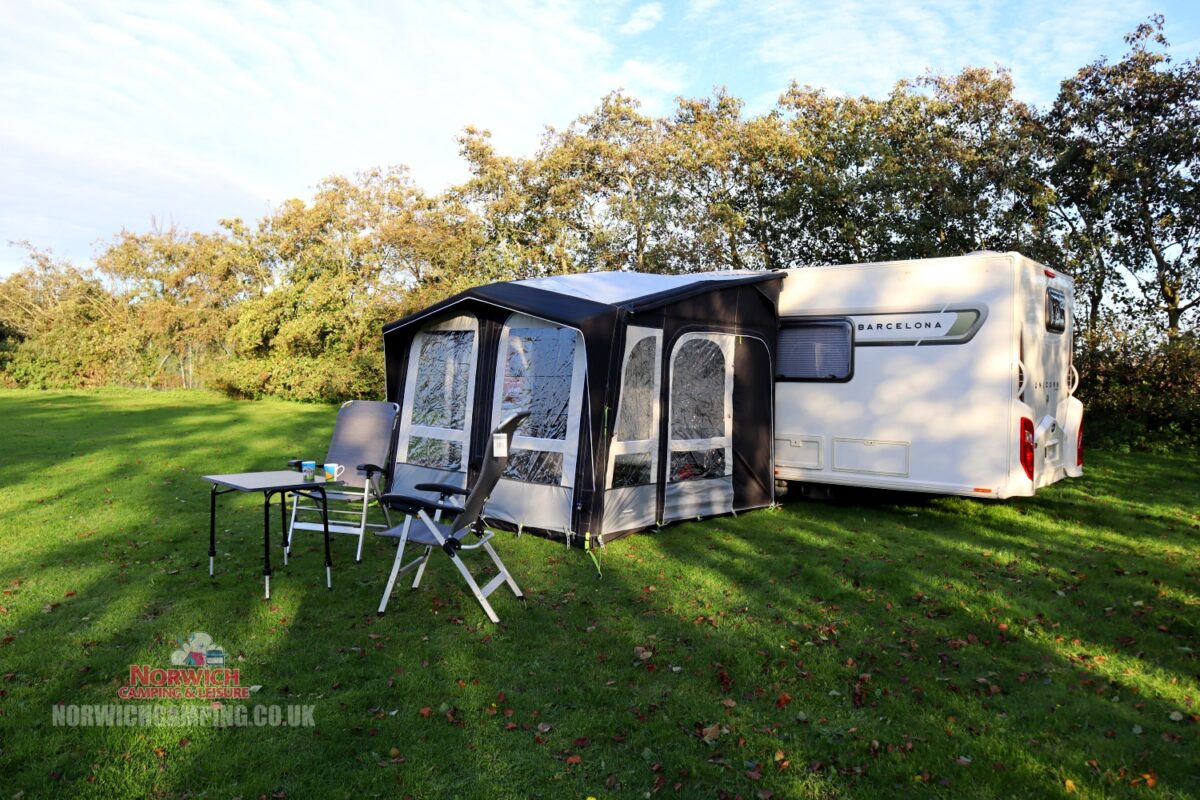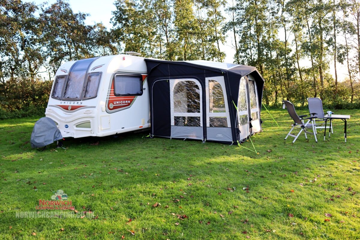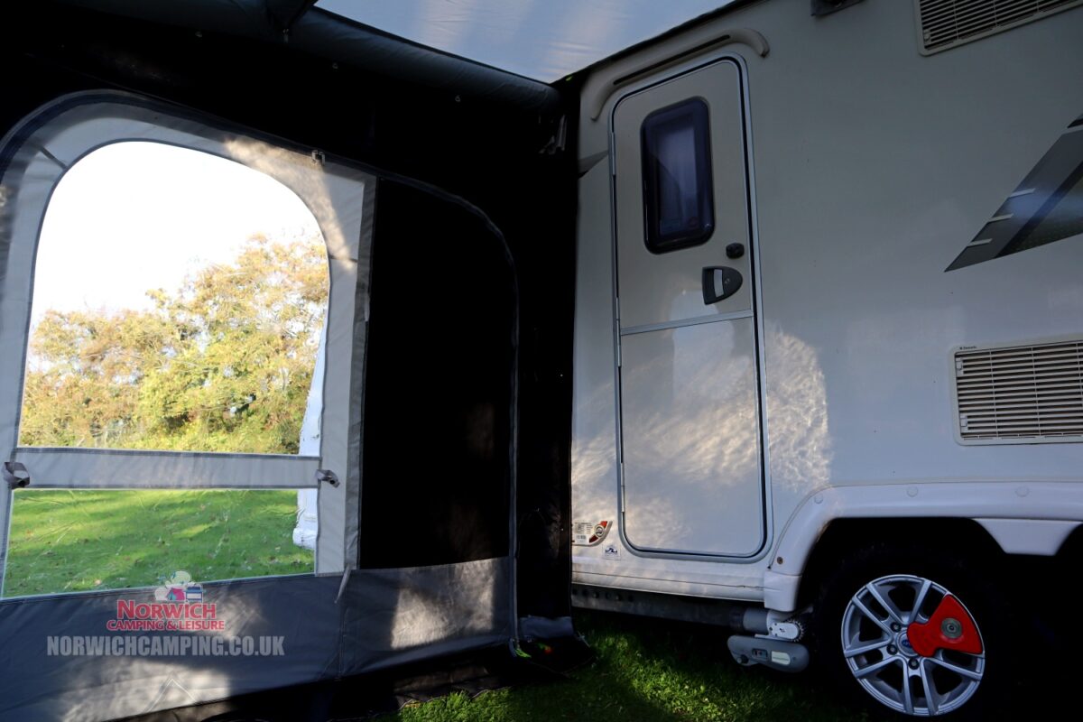 Please note: models no longer come supplied with upright poles. Deluxe Upright Poles will not fit ‘M’ models. Some photos show the lower-height ‘S’ model attached to a caravan, though this is basically the same awning as the ‘M’ model.