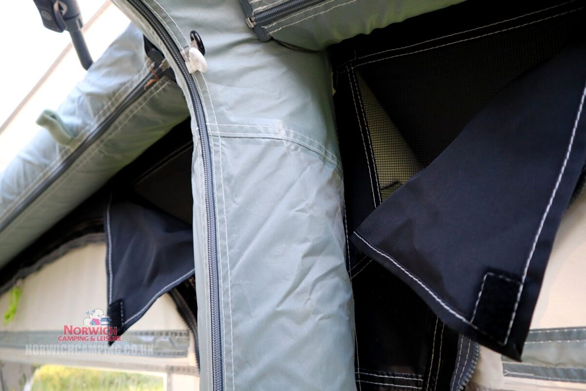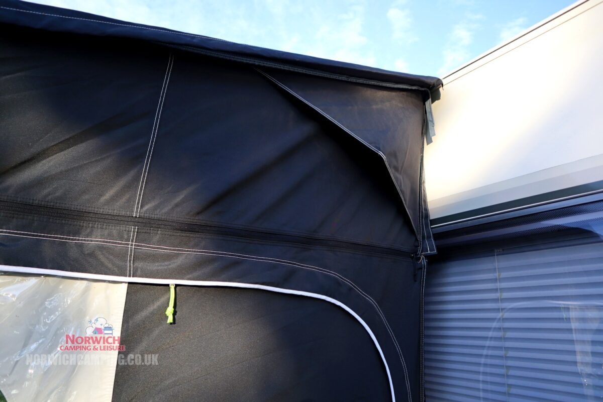 Kampa’s new design feature that ensures a minimum 1.83m/6ft of interior headroom in their awnings, whilst also deflecting wind and shedding rainwater to avoid puddling on the roof.