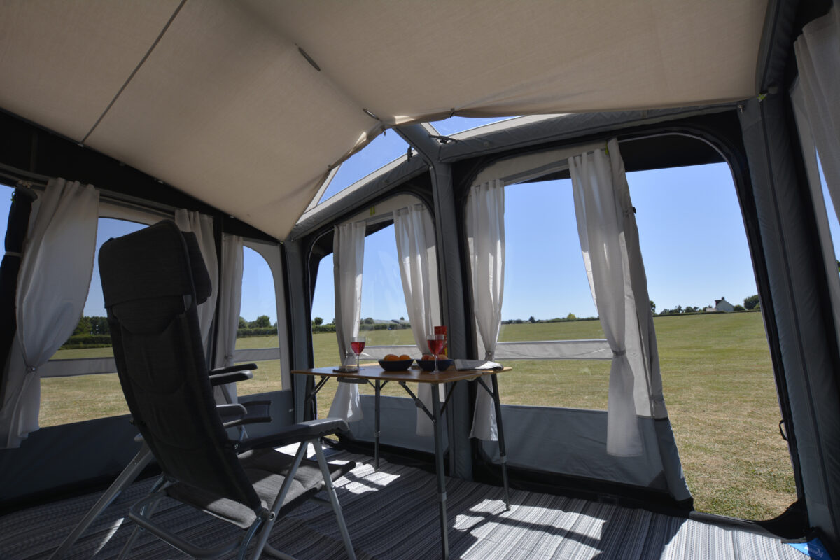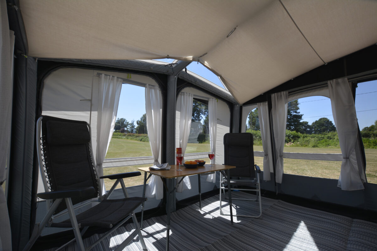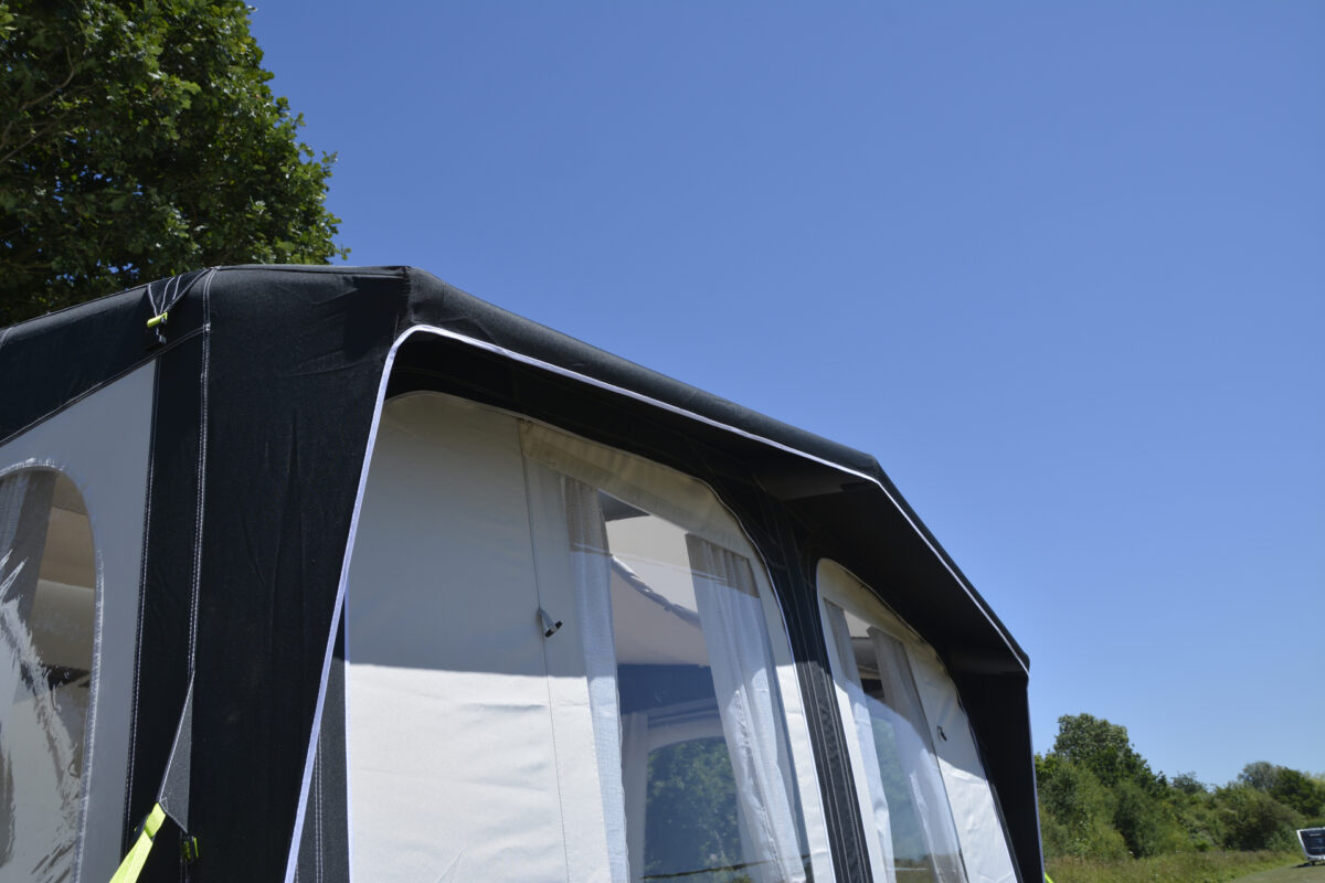 Kampa’s new design feature that ensures a minimum 1.83m/6ft of interior headroom in their awnings, whilst also deflecting wind and shedding rainwater to avoid puddling on the roof.