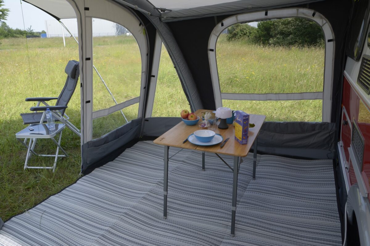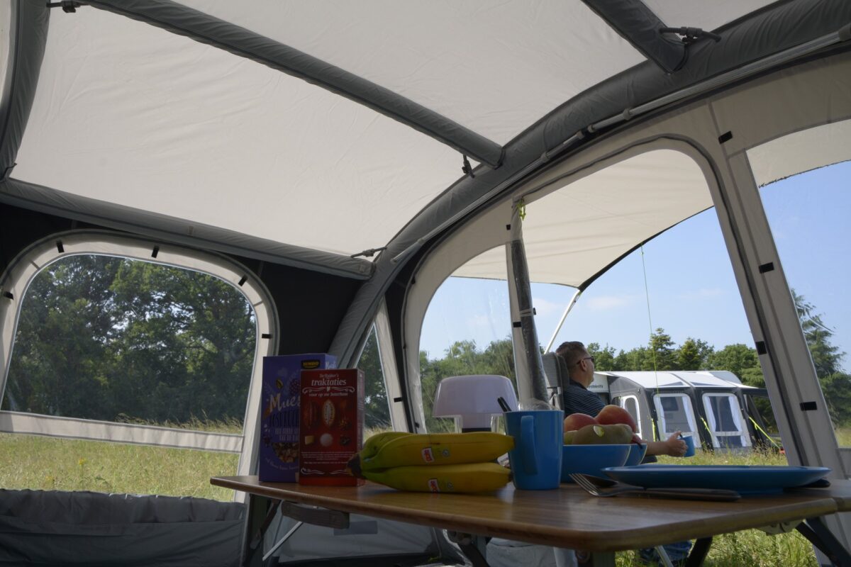The rear of the awning has an extra inflatable tube which raises the centre height making it a full height awning with plenty of head room and a light air feel, the pop has plenty of windows for great views and allowing light in the awning. the pop also has closable mesh panels to provide ventilation when needed.