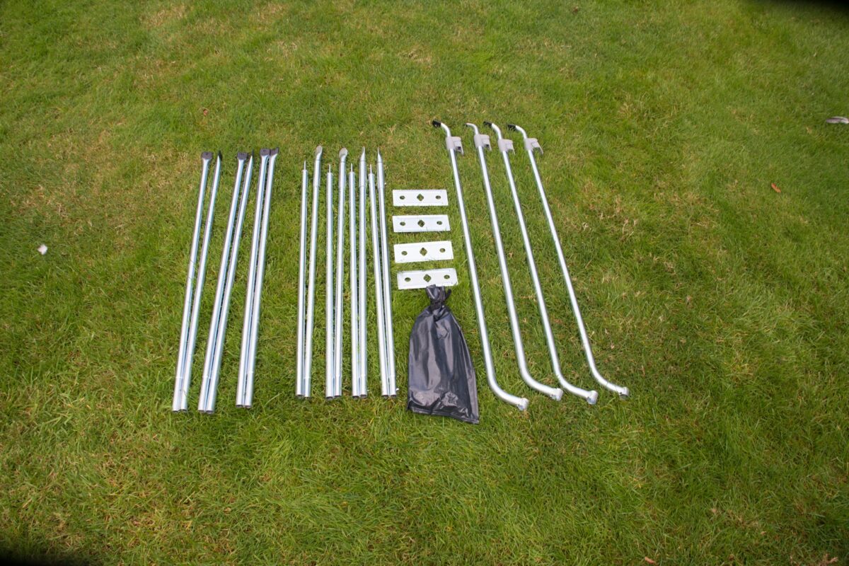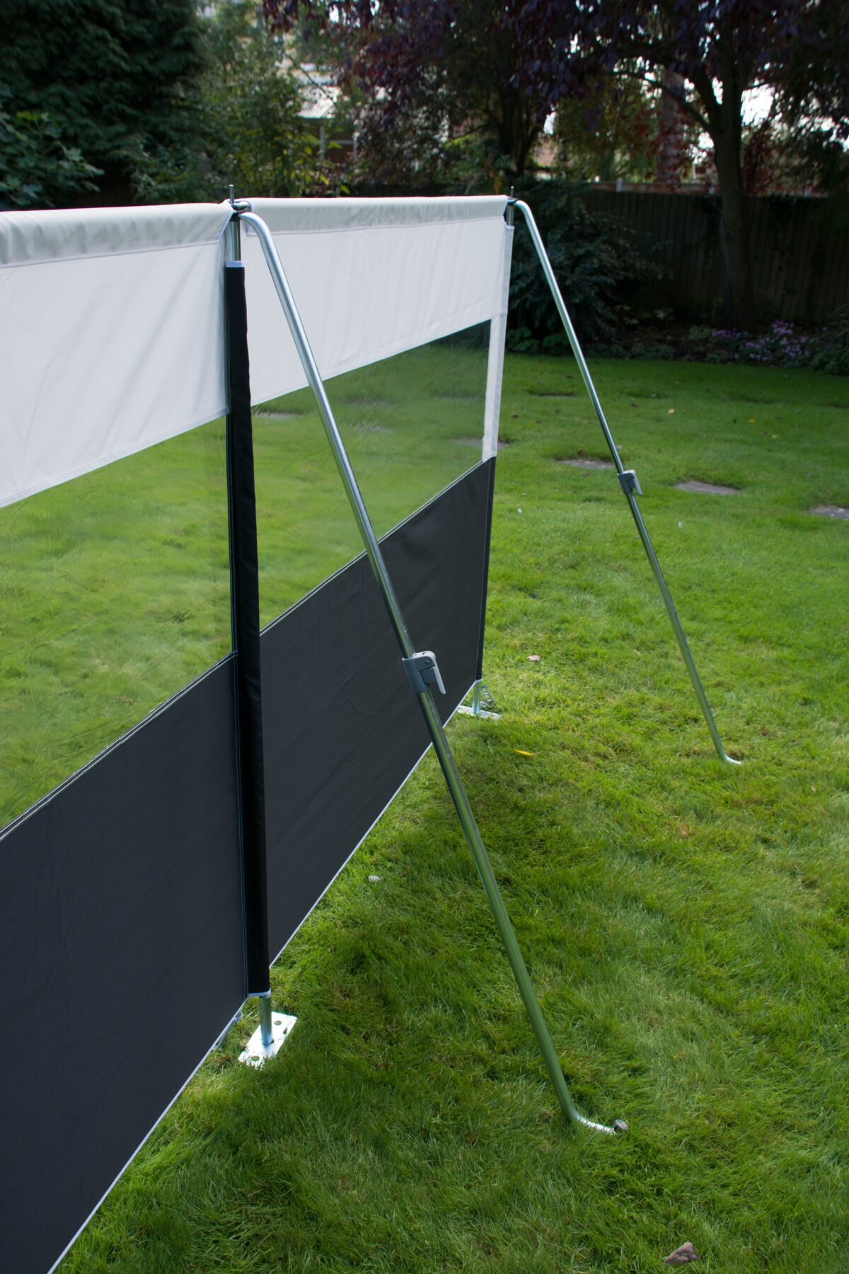 The Dometic Pro windbreak is supplied with very strong plastic pegs and adjustable pegging ladders (to be used along the bottom of the windbreak to peg it to the ground)