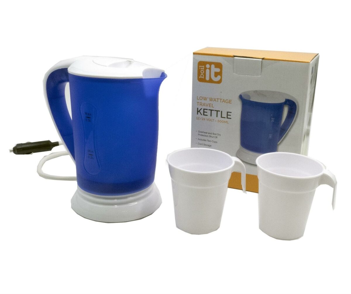 ON/OFF indicator light, 12v or 24v, automatic switch off. Includes 2 plastic mugs that can be stored inside the kettle. Individually boxed.