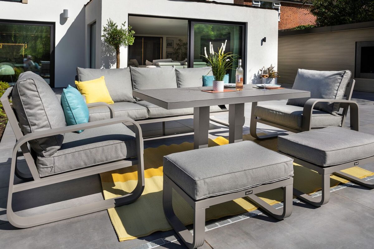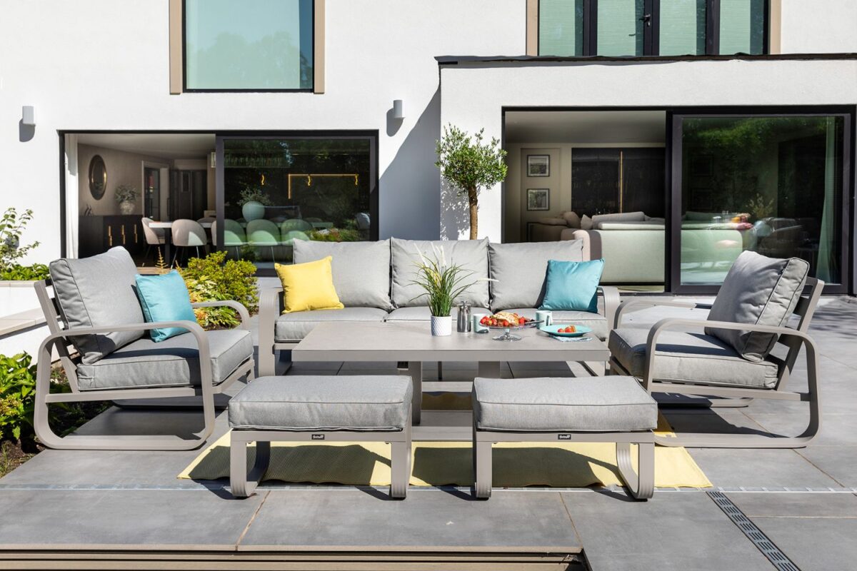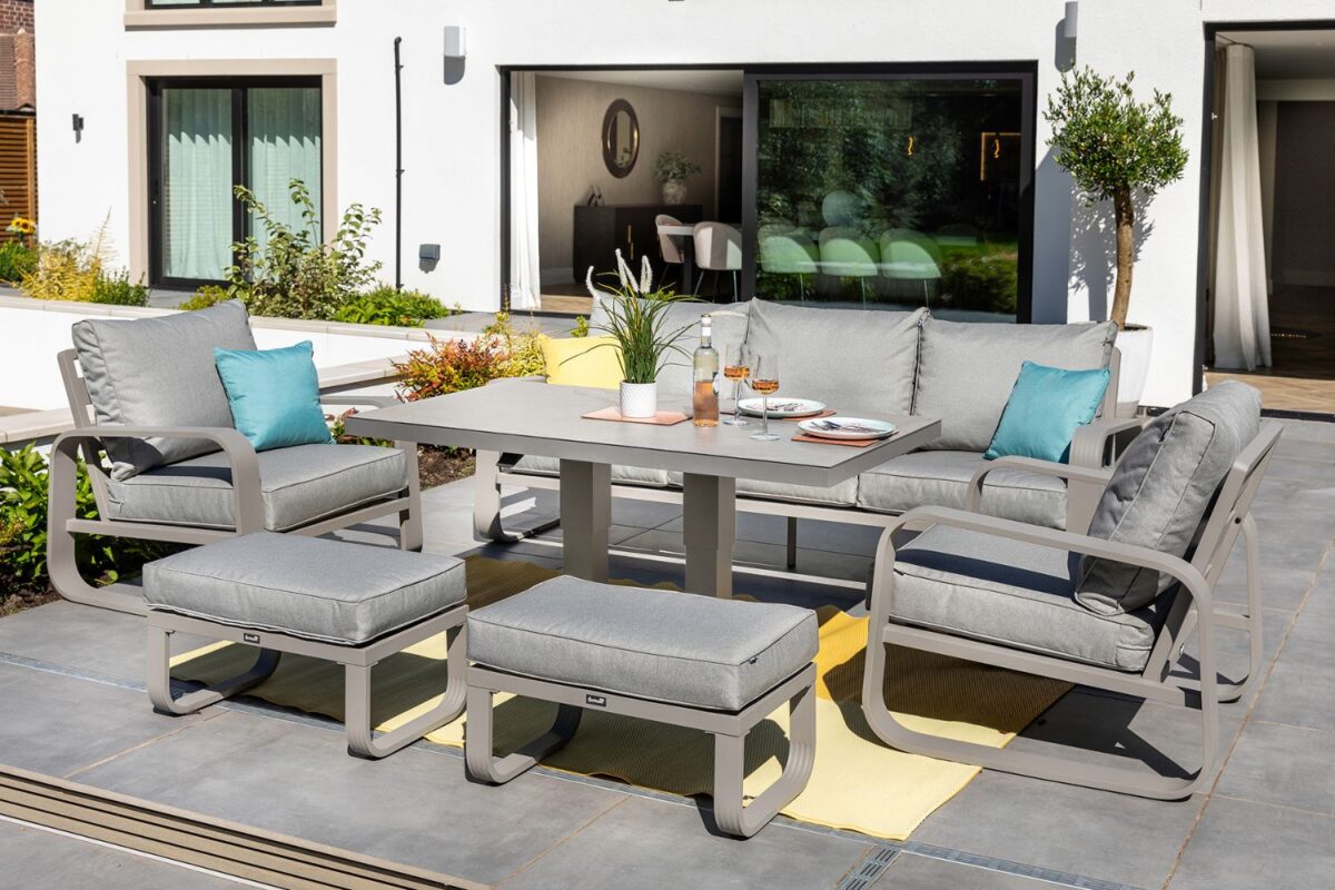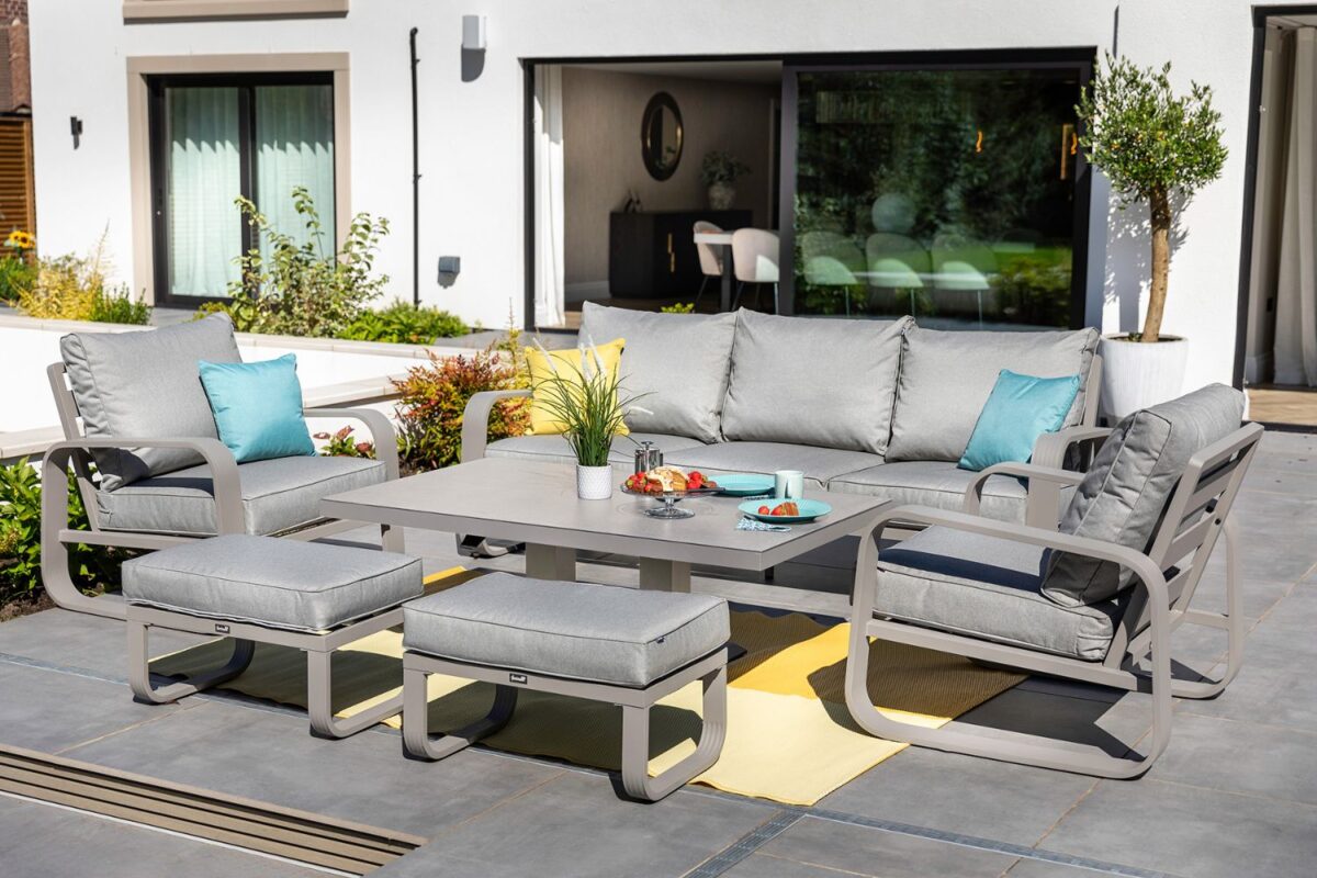 The impressive new Arlo range revitalises contemporary aluminum furniture with eye catching curves, a calming palette and additional comfort from the extra large Weatherready® cushions, finished with our sumptuous textured pewter fabric. The height adjustable table which is operated by a gas pump hand-lever and finished with our popular heat and scratch resistant Tuscan Ceramic Glass table tops, enables you to enjoy your garden from elevenses through to evening dinner the Arlo 3 Seat lounge set is perfect for socialising with loved ones, whilst adding a modern look to your outdoor space.