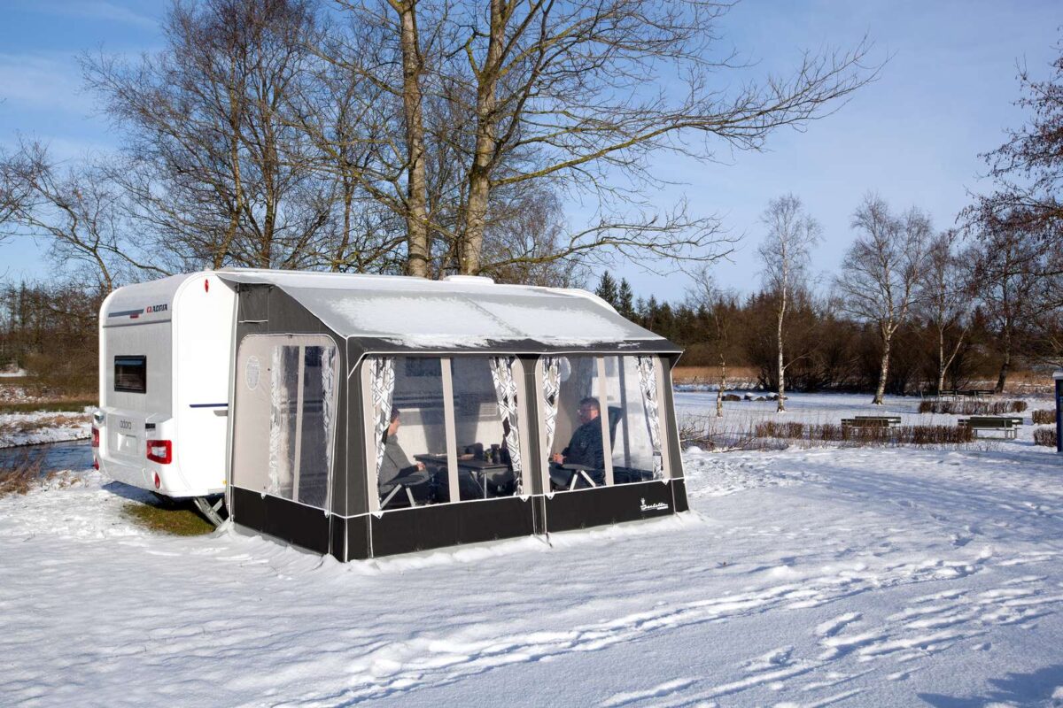 Universal 420 and 360 Dawn have doors in both sides and large windows across the front, giving a good view. The strong Zinox steel frame ensures good stability. If Universal 420 or 360 Dawn is to be used as a year-round awning, we recommend the fitting of winter securing and an inner roof (optional extras). The roof construction provides unobstructed opening of the caravan door and minimal build-up of snow.