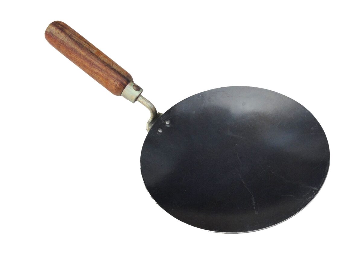 - Wooden handle and mild steel pan.