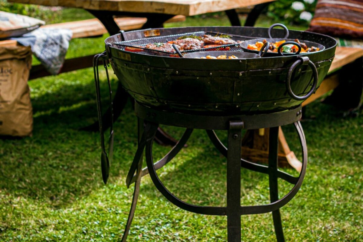 These beautiful and functional barbecue fire bowls are handmade from recycled oil drums by family workshops in India. Hand cut metal plates are riveted in the traditional way for strength and durability and feature the same drop handles as the Original Kadais. The Gothic Stand is a sturdier more ornate alternative to the High Stand but is still the perfect height for cooking when using your fire bowl as a barbecue.
