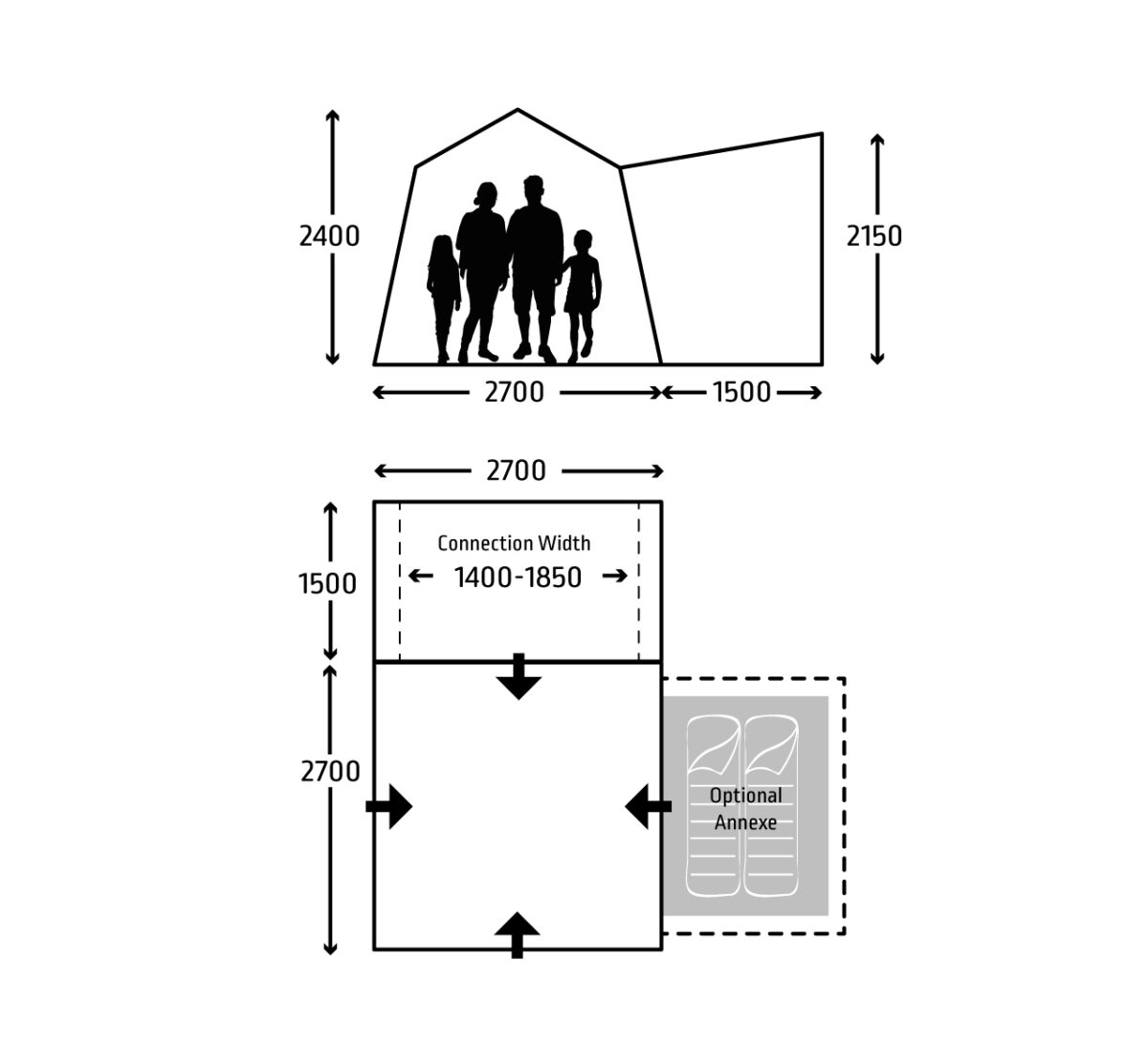 Building on the success of the popular Cross AIR VW, this tailgate awning allows the living area of the van to flow smoothly into the awning. The Weathershield 150D material keeps its weight and pack size to a minimum, while the sturdy Multi Point Inflation AirFrame ensures quick set-up and reliable protection from the elements. Zip-on the optional sleeping annexe to accommodate guests.