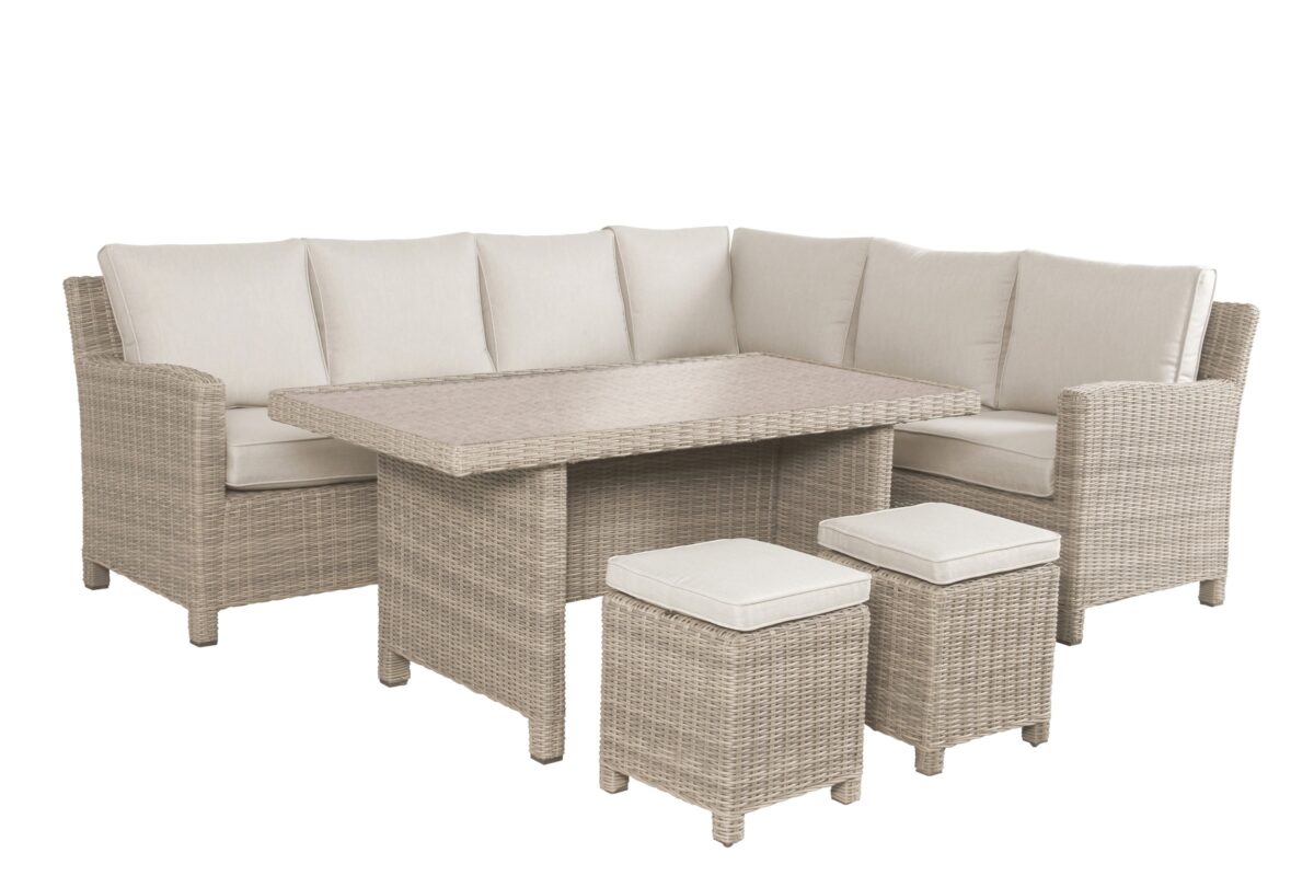 The Kettler Palma Left-Hand Corner with Glass Tabletop – Oyster is made from hand-woven weather-proof weave and comprises two 3-seater benches, with the longer being on the left-hand side, with glass-topped rectangular table and two stools.