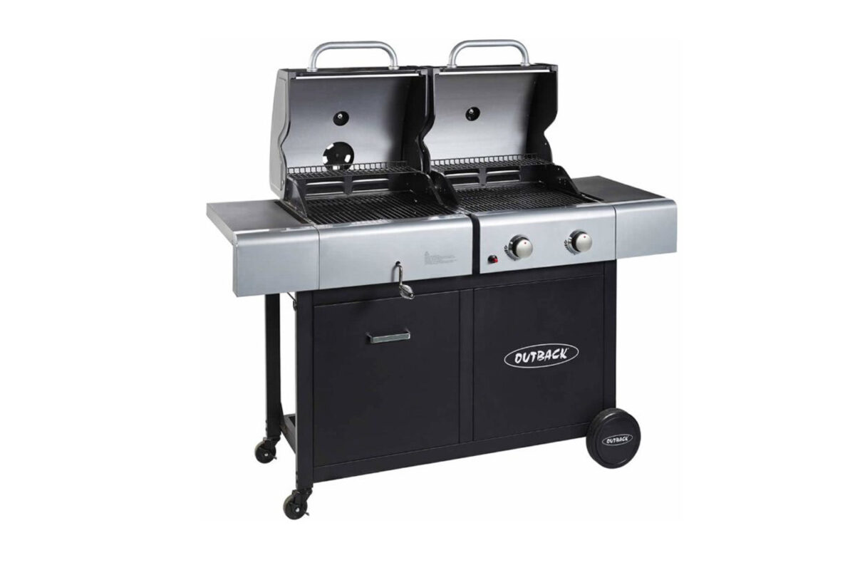 For the ultimate choice of outdoor entertaining, the Outback Dual Fuel 2 burner gas and charcoal combi barbecue offers the chance to impress a sizeable party of guests with a traditional charcoal-cooked menu, or a gas-fired selection that is sure to keep up with demand. It comes with porcelain-enamel roasting hoods, 2 porcelain coated wire grills for charcoal cooking, 1 cast iron grill and 1 cast iron griddle for gas cooking, fixed warming racks, side tables, air vents, piezo ignition and bottle opener function. Dual Fuel 2 Burner is supplied with hose and propane regulator.