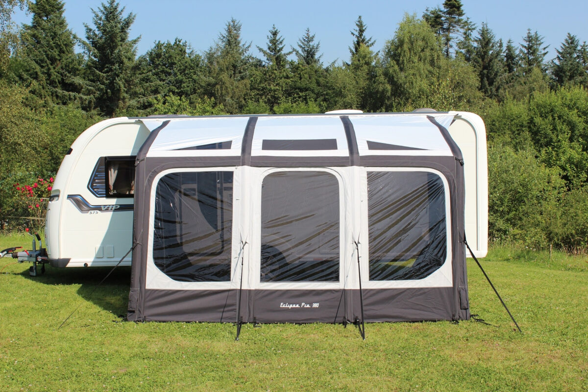 The Eclipse Pro 380 has plenty of ventilation, with toughened zip back breathable mesh panels built into both side doors, letting in plenty of air whilst keeping out flying bugs. A full zip in mesh accessory door is also available for both side doors, as well as the central front panel – perfect for warm climates, another great addition is the optional Conservatory Annexe which can be zipped to either side of the awning creating a large sleeping area, or a windowed conservatory/storage space.