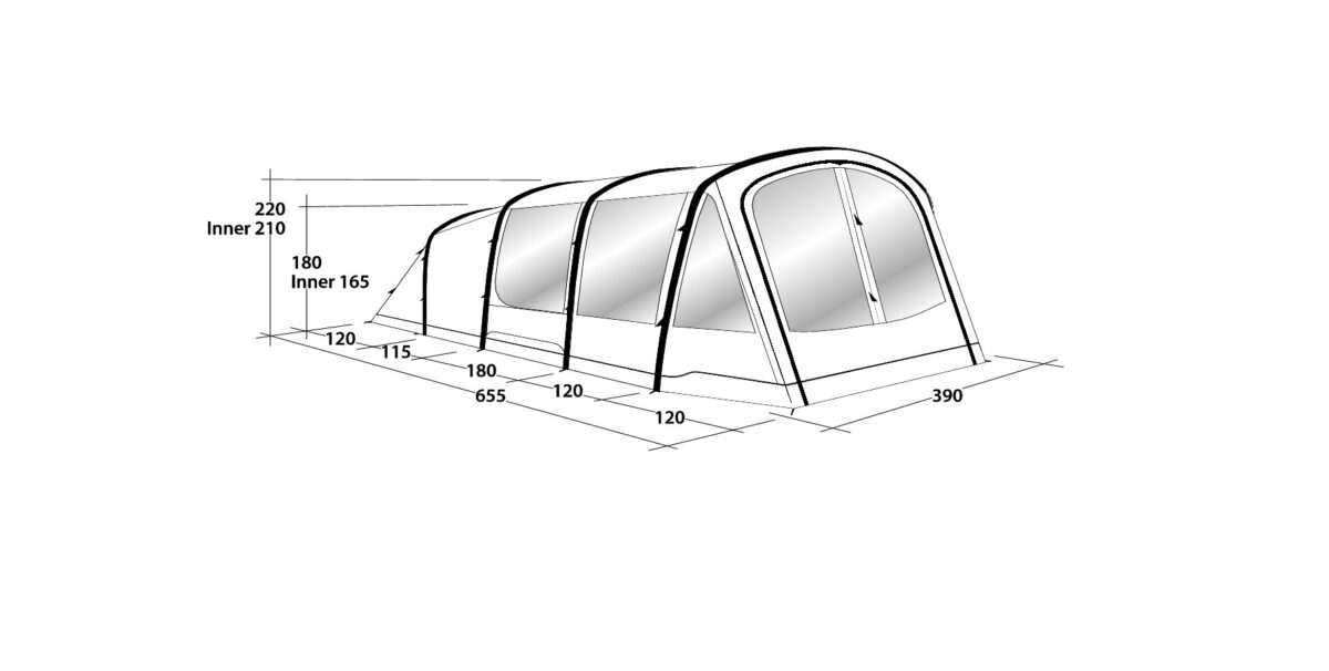 The inflatable design makes pitching quick and easy. With plenty of living area, sleeping space, and a Dark Premier bedroom with good mesh ventilation and two zipped dividers, the large design offers a three-zone arrangement.