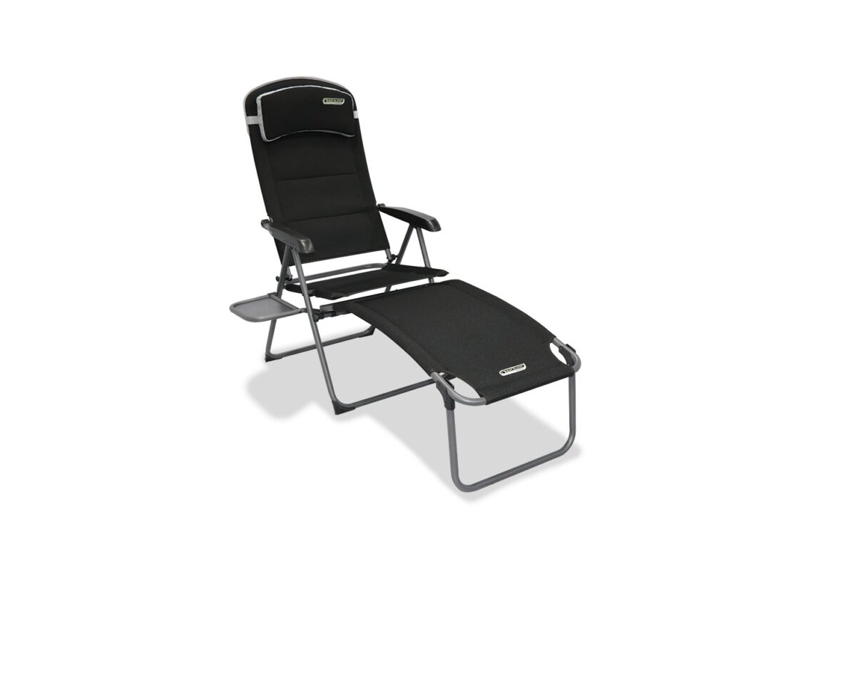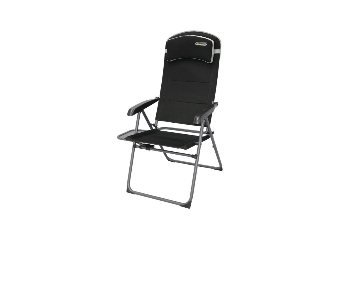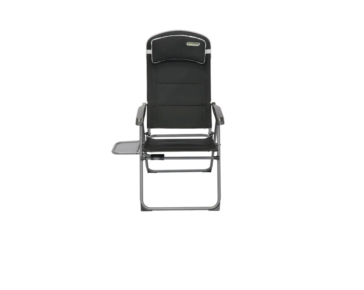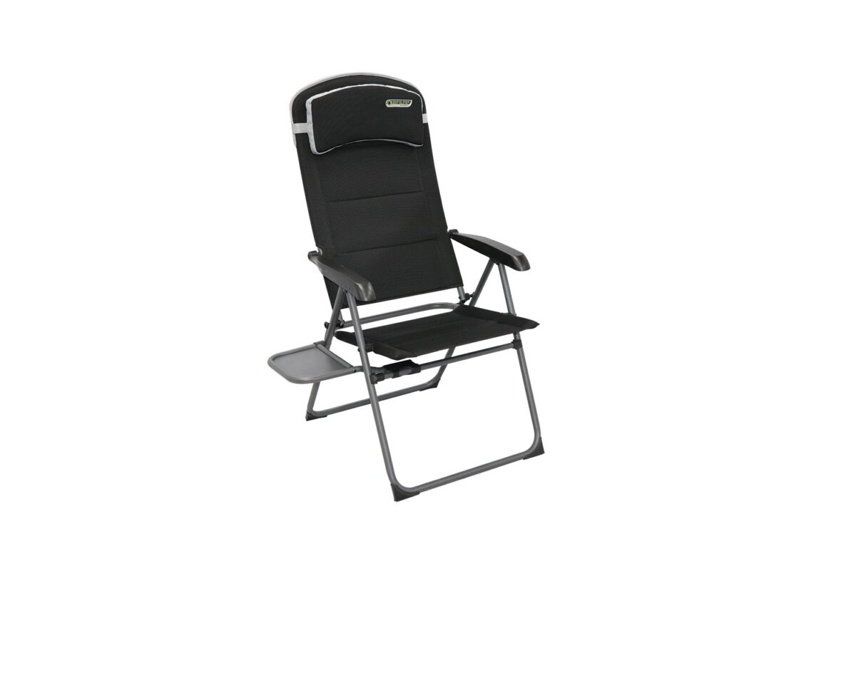 The Quest Elite Vienna Pro Recline Chair with Side Table – Black is an excellent, lightweight reclining chair. It features the latest generation of the premium Q-Tex 2D mesh fabric which gives you cushioned comfort, class-leading durability, excellent weather resistance and all-weather usage. The chair has a 6-position adjustable recline, allowing you to adjust the backrest when required. The adjustable headrest also adds more comfort and can be used as a lumbar support if required. The addition of the exclusive slide-out side table means you have a handy table whenever you need it. The chair is finished off with a strong steel frame, with a premium mottled-effect coating. The solid armrests on this chair give added comfort and great support. They also make it easier to get in and out of the chair for those with limited mobility. When not in use, the chair can be folded flat to make it easy to carry and store away.