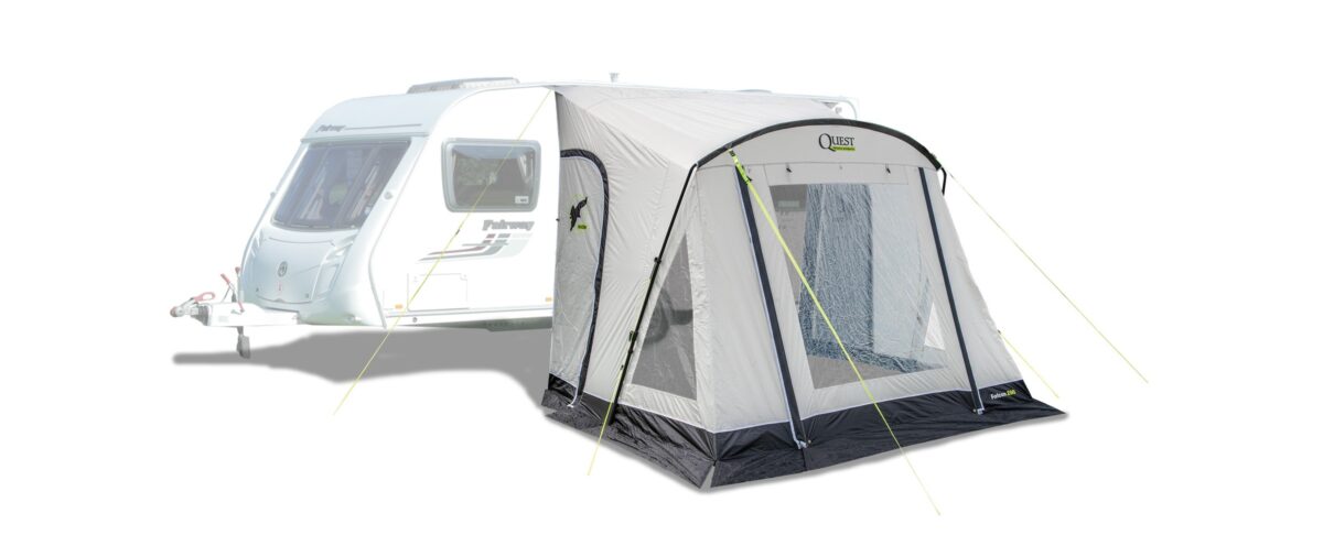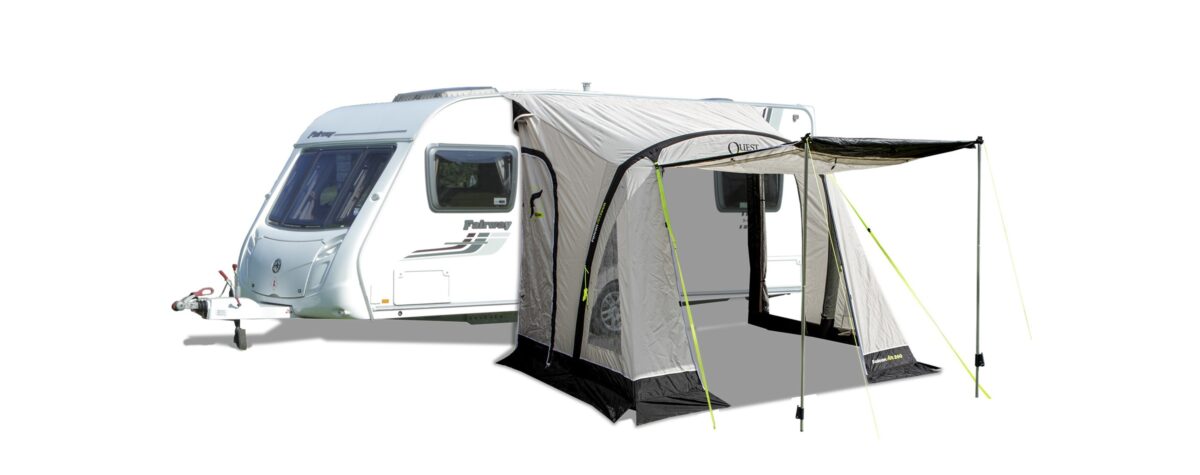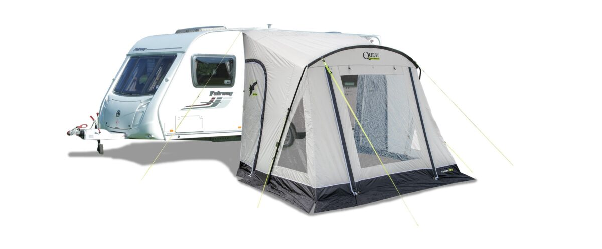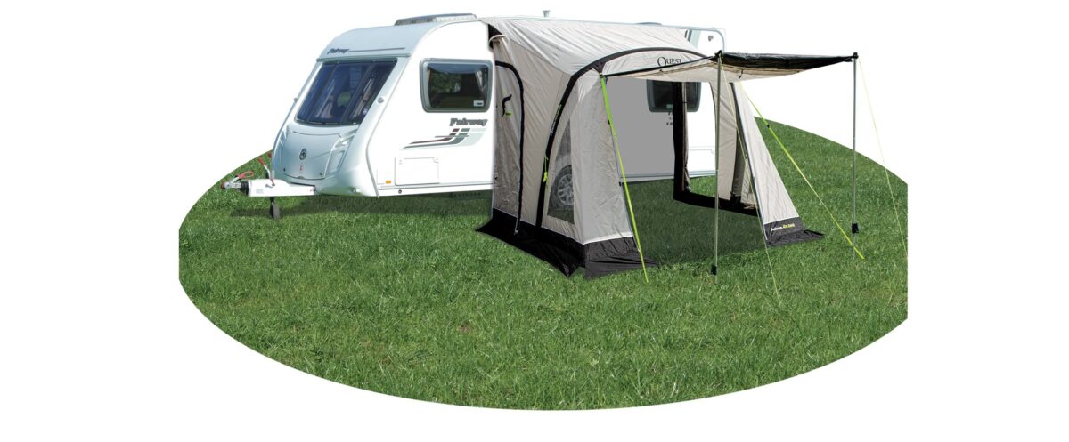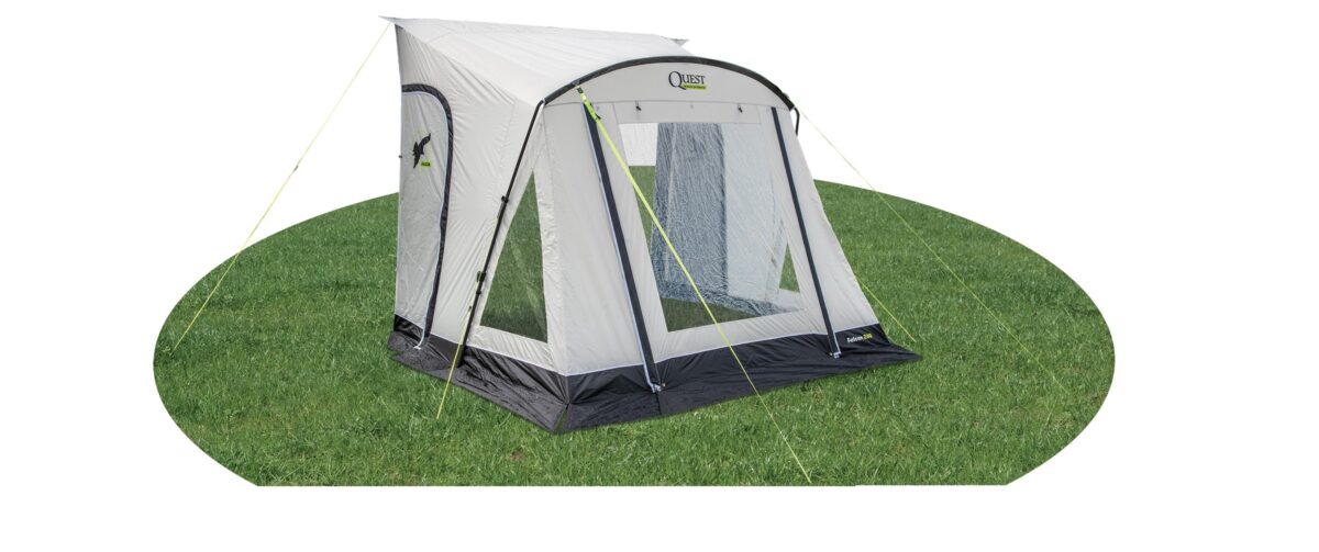 The awning is all about ease of use and value. It features an easy to use, minimal quick-fit pole system. This pole system is quick to put together, lightweight and adjustable to help ensure the best pitching even on uneven ground. The pitching is easy enough to be done by a single person if required. It uses the modern Quest Tec 75 fabric which is lightweight, quick drying and extremely waterproof making the awning easier to use and maintain. It is U.V. coated to help protect it from the harmful UV rays which helps extend its lifespan and gives you a U.P.F. rating of 50+ which is the highest possible giving you complete protection.