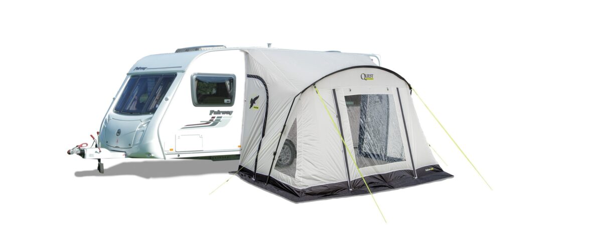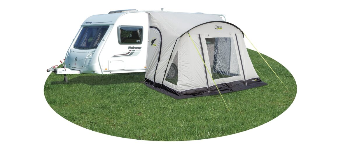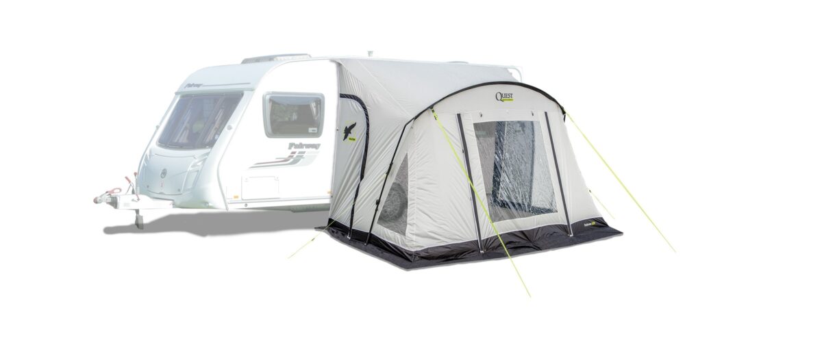 The awning is all about ease of use and value. It features an easy to use, minimal quick-fit pole system. This pole system is quick to put together, lightweight and adjustable to help ensure the best pitching even on uneven ground. The pitching is easy enough to be done by a single person if required. It uses the modern Quest Tec 75 fabric which is lightweight, quick drying and extremely waterproof making the awning easier to use and maintain. It is U.V. coated to help protect it from the harmful UV rays which helps extend its lifespan and gives you a U.P.F. rating of 50+ which is the highest possible giving you complete protection.