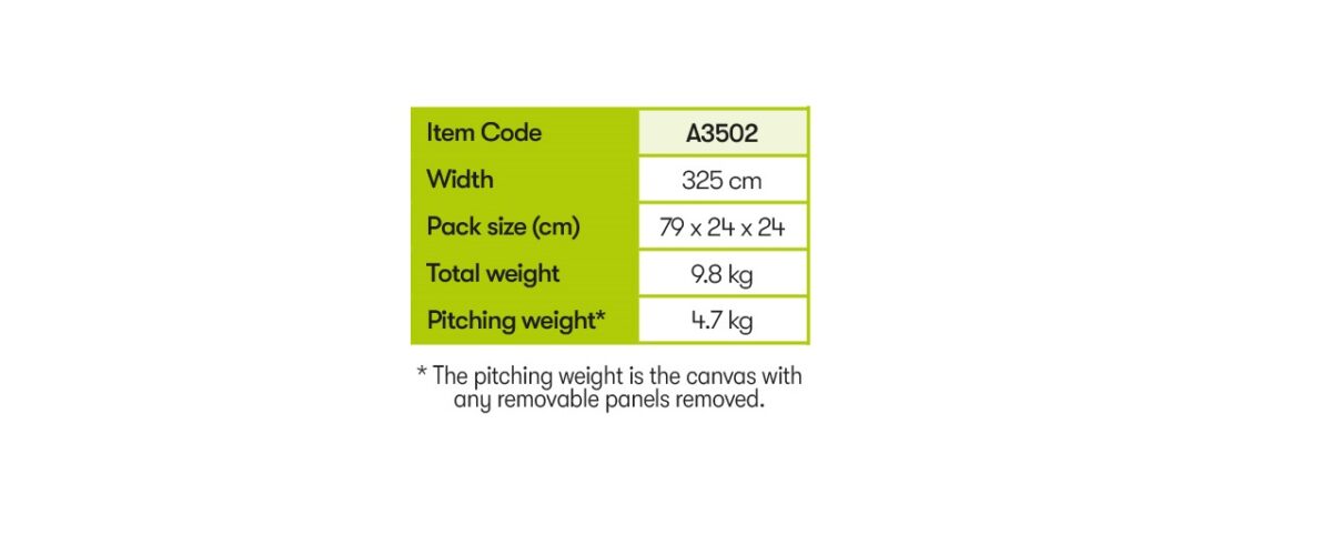 - Pitching Weight: 5.8 kg (This is the weight of just the canvas with any removable panels removed)