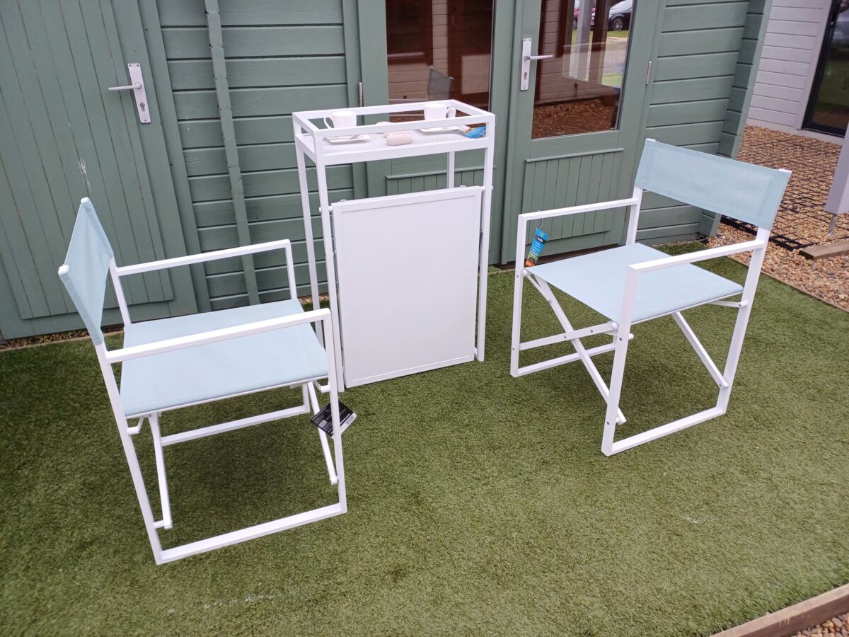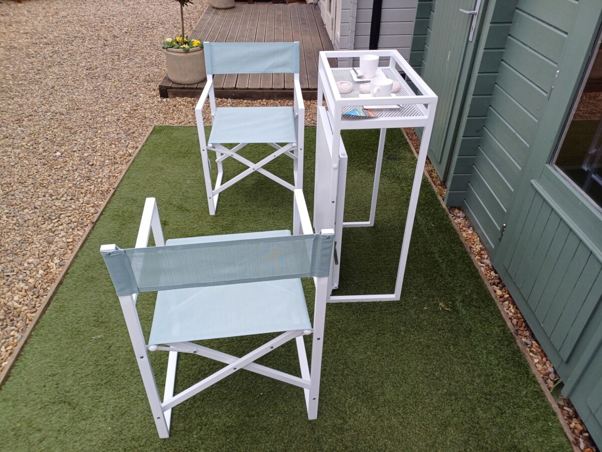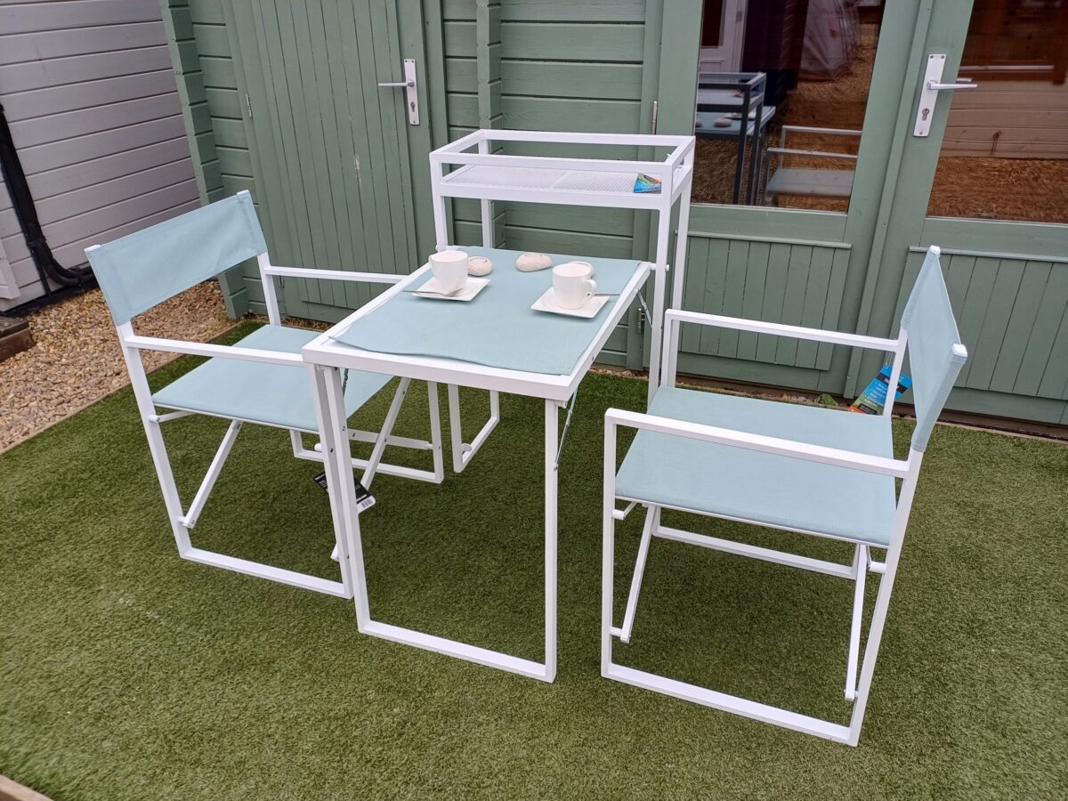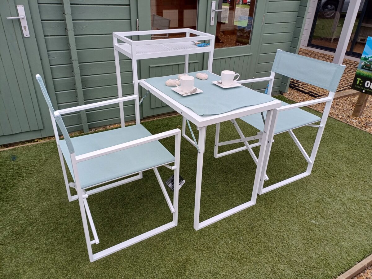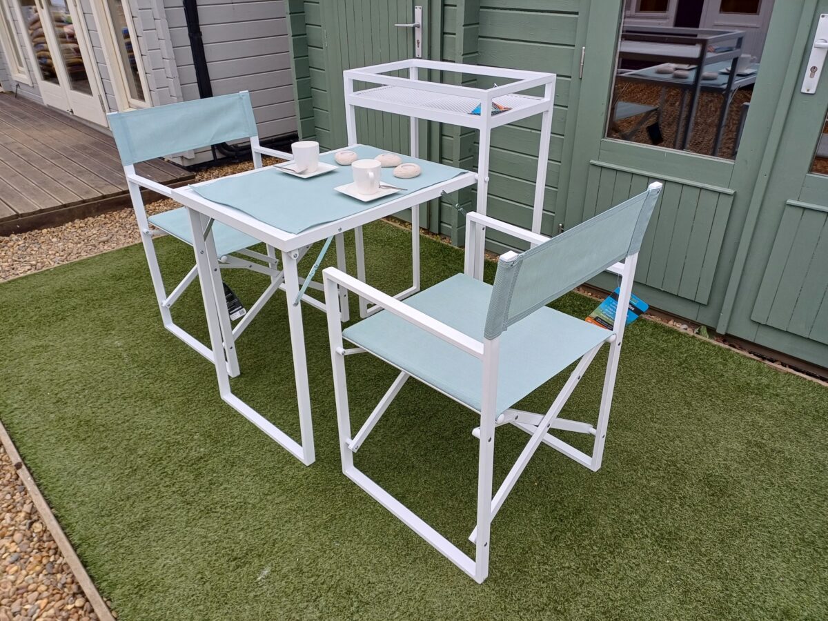 The Quest Versailles Folding Garden/Balcony Set features a sturdy steel frame with a durable powder-coated finish and weather-resistant fabric, simple storage by folding, rubber feet that won’t slide around and act as floor protectors.