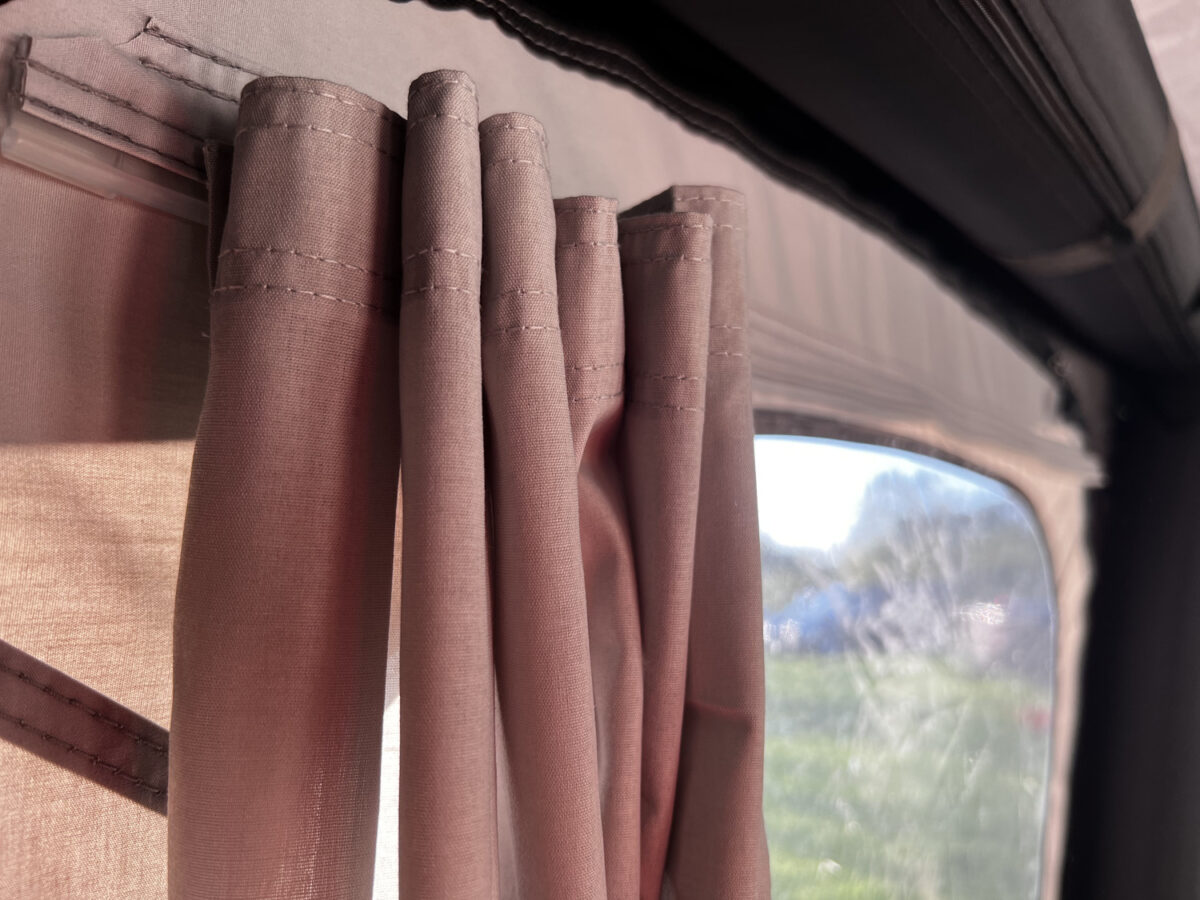 A double-pitched roof helps with water run-off whilst also ensuring that there is plenty of room for the vehicle door to be opened into the awning without catching on the roof.