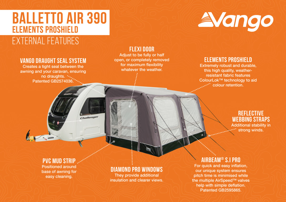 Constructed using Vango’s new Elements ProShield fabric, which is extremely durable and weatherproof with the added benefit of ColorLok technology to help colours hold up better against UV light. The Balletto Air 390 can handle anything from family meals and relaxation to convenient storage and additional bedroom space.