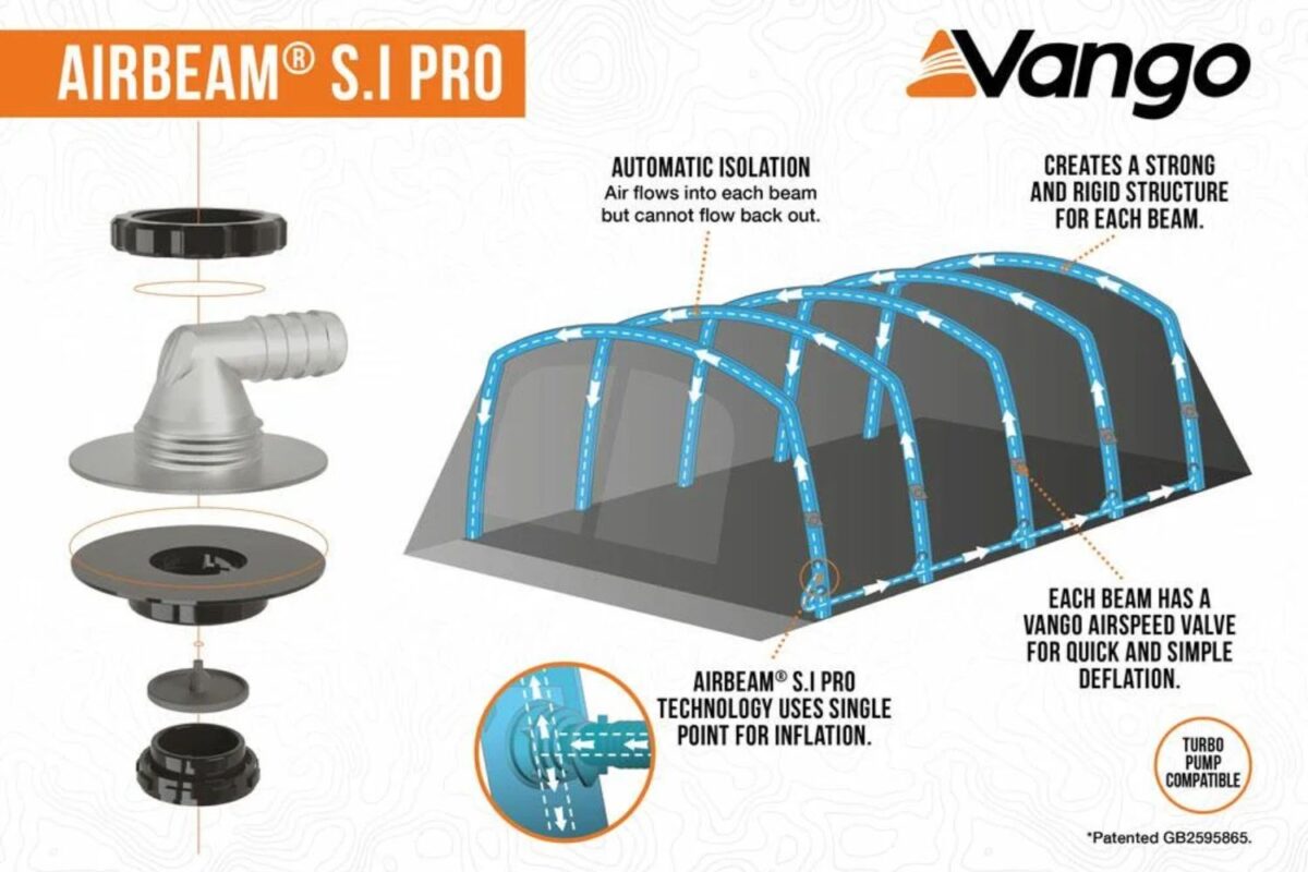 AirBeam® S.I Pro – Single Point Inflation – With 10 years’ experience of AirBeam® development and testing, Vango introduces single point inflation, a new and revolutionary feature for quick and easy inflation through the AirSpeed S.I Pro valve. Our unique system ensures pitch time is minimised while the multiple AirSpeed™ valves help with simple deflation. The added feature of self-isolated AirBeams® ensures that in the unlikely event of a puncture, the structure remains strong and functional. Patented GB2595865
