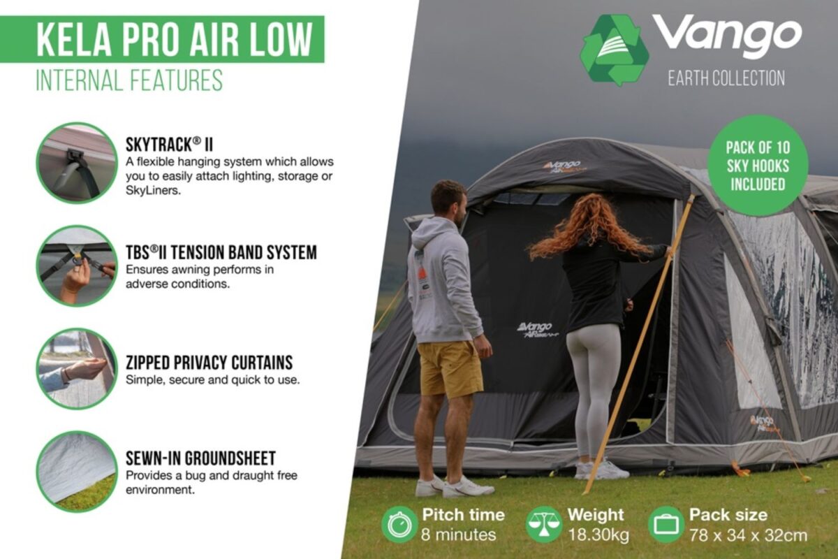 An excellent space to spend time with friends and family, the hugely popular Vango Kela drive away awning inflates in a few minutes leaving you with more time to enjoy your break.