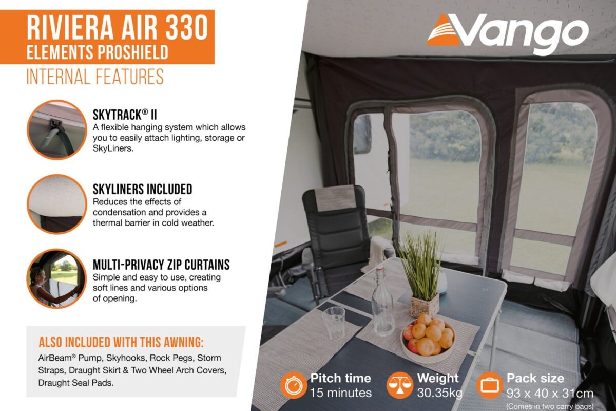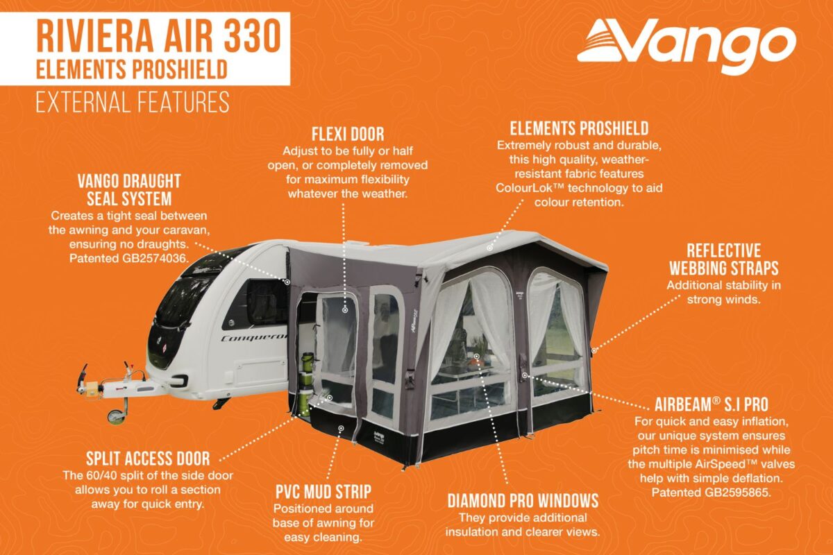 The Vango Riviera Air 330 ProShield Awning 2023 provides a home-from-home feel wherever you go