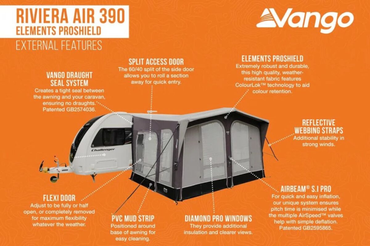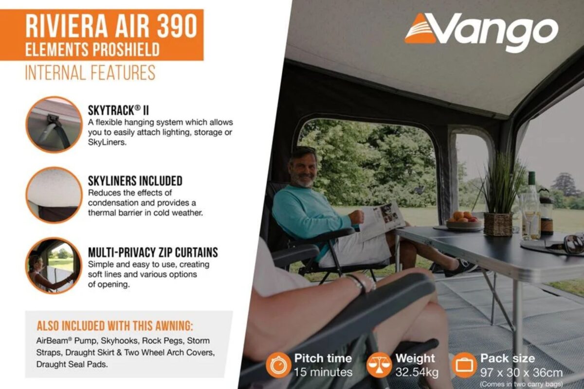 Constructed from Vango’s durable Elements ProShield fabric, the Riviera Air 390 ProShield will withstand even the fiercest weather conditions. It also includes premium features like Diamond Pro Windows for crystal-clear views and excellent insulation.