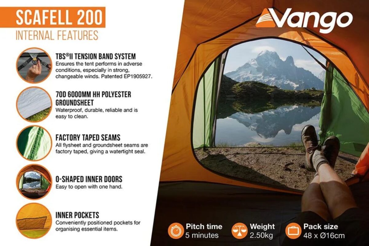 The Vango Scafell 200 2-person tent has an exceptional space-to-weight ratio