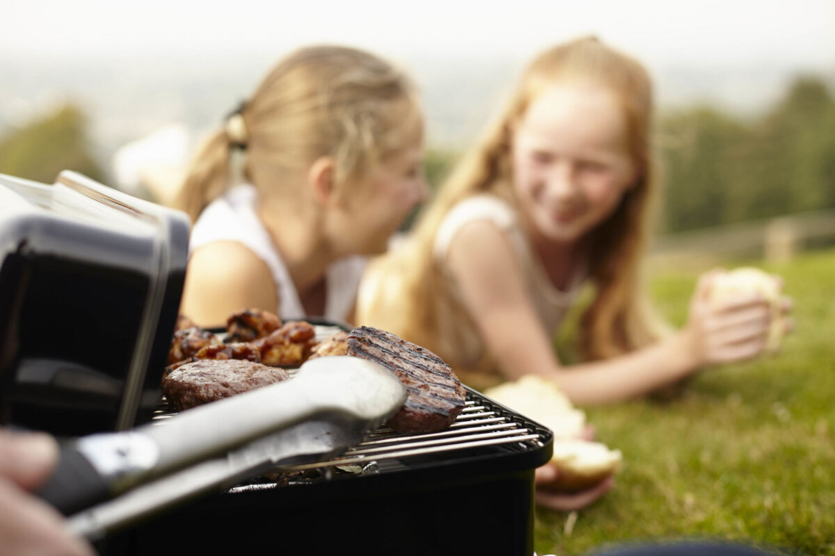 Fold-away stand raises barbecue and prevents burning surface.