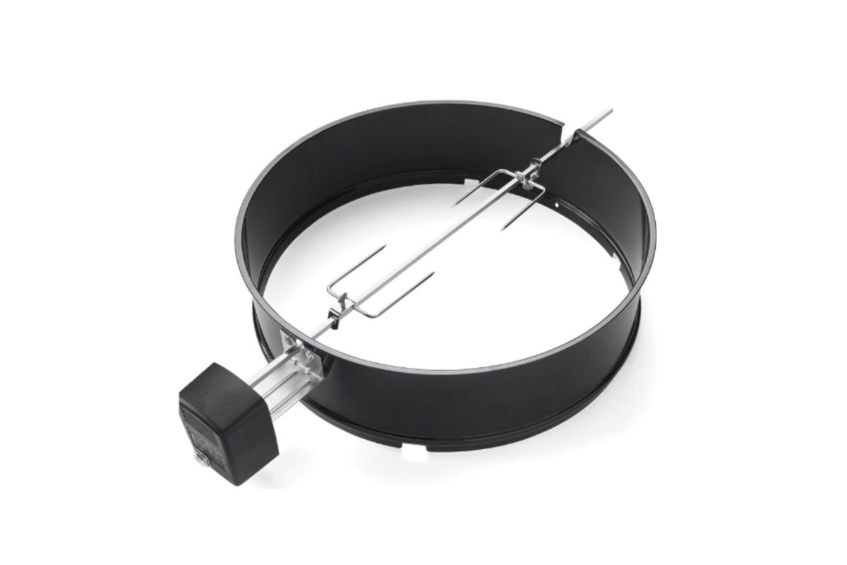 Infuse your foods with the taste, crispiness, and juiciness that only rotisserie cooking can achieve. The Rotisserie Kit includes a porcelain-enamelled ring, rotisserie shaft and forks, electric motor and all necessary hardware. While the ring creates an optimized space for your rotisserie to rotate within your charcoal barbecue, the two spit forks that adjust along the shaft hold any size cut of meat, and the electric motor slowly rotates your food above the coals. The porcelain-enamelled ring also allows you to use it as an extension piece, creating more vertical cooking space in the barbecue. This makes it possible to cook larger pieces of meat without being limited by the height of your barbecue lid. With the Rotisserie you can rest assured that you’ll have a juicy, evenly cooked meal every time, due to its built-in, rotating mechanism. Designed to fit Weber’s 57-cm charcoal barbecue models.