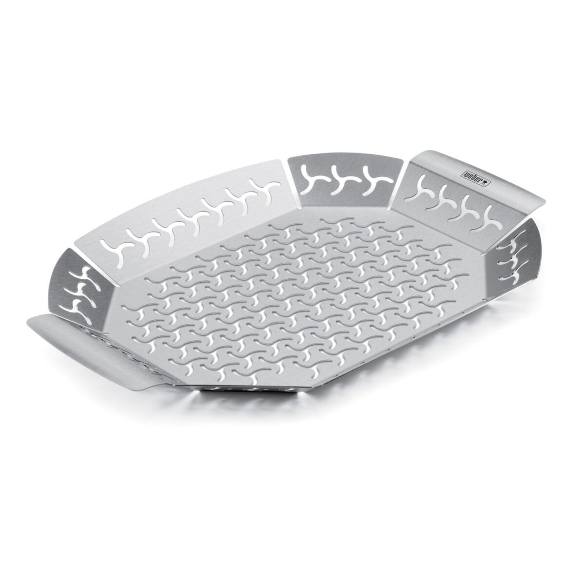 Stainless steel grill pan keeps vegetables and small cuts of meat or fish from falling through the cooking grates