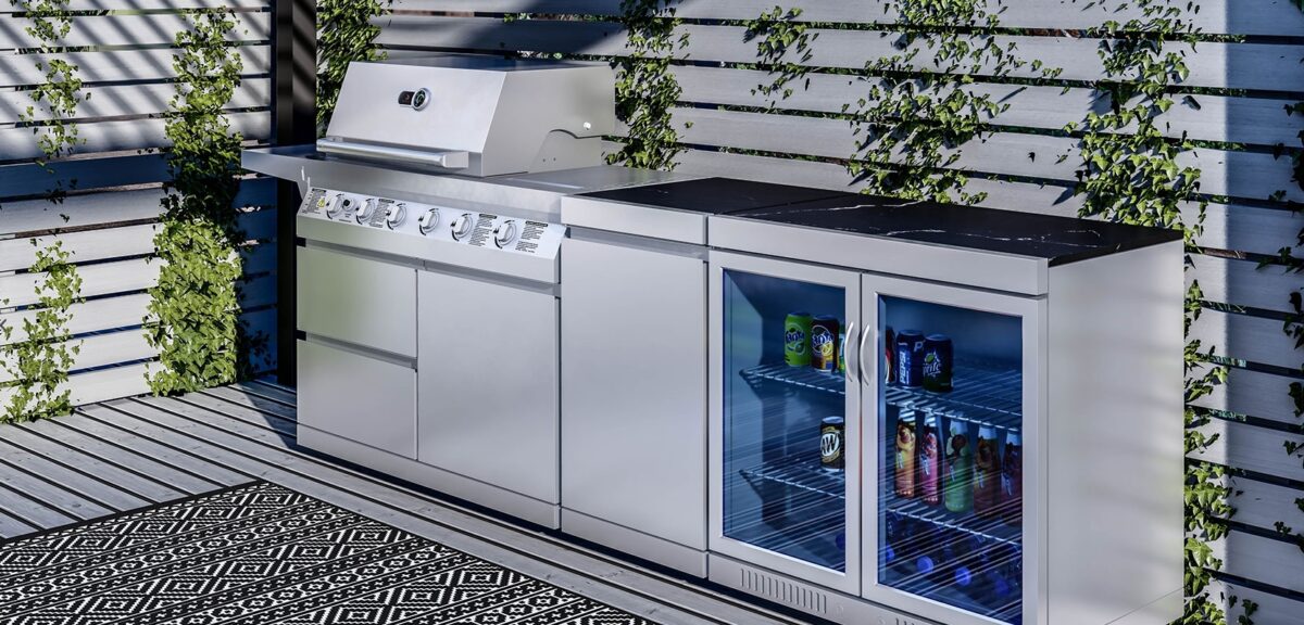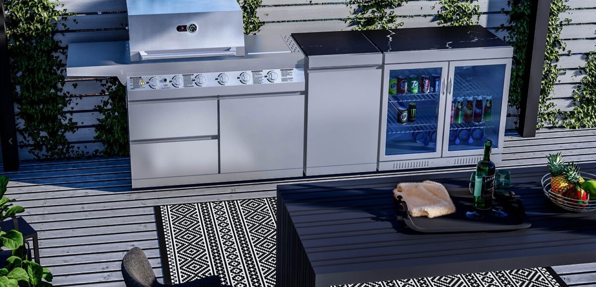 Whistler The Blockley 4-Burner Outdoor Kitchen – create your dream outdoor kitchen area with Whistler’s stainless steel modular system, this combination comes with a stylish BBQ and outdoor fridge to bring your home cooking outside. This small outdoor kitchen is designed for those smaller spaces and home gardens.