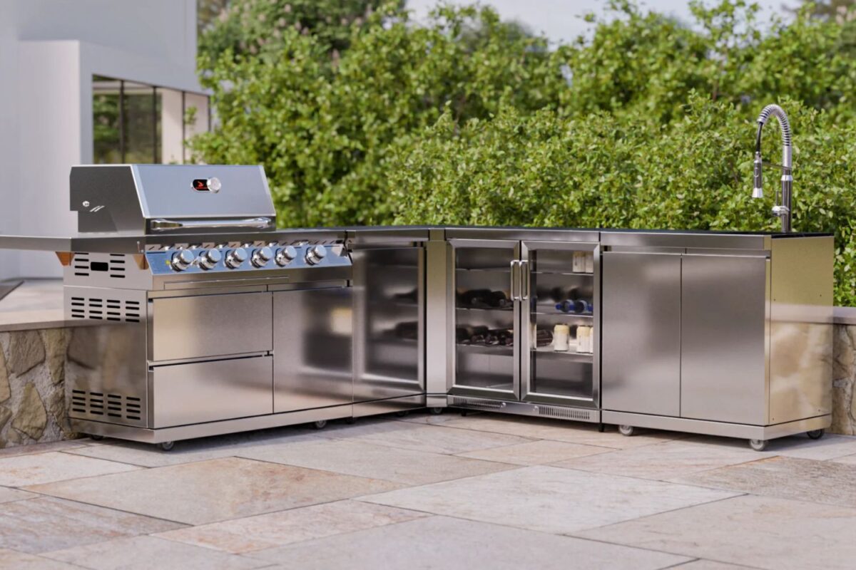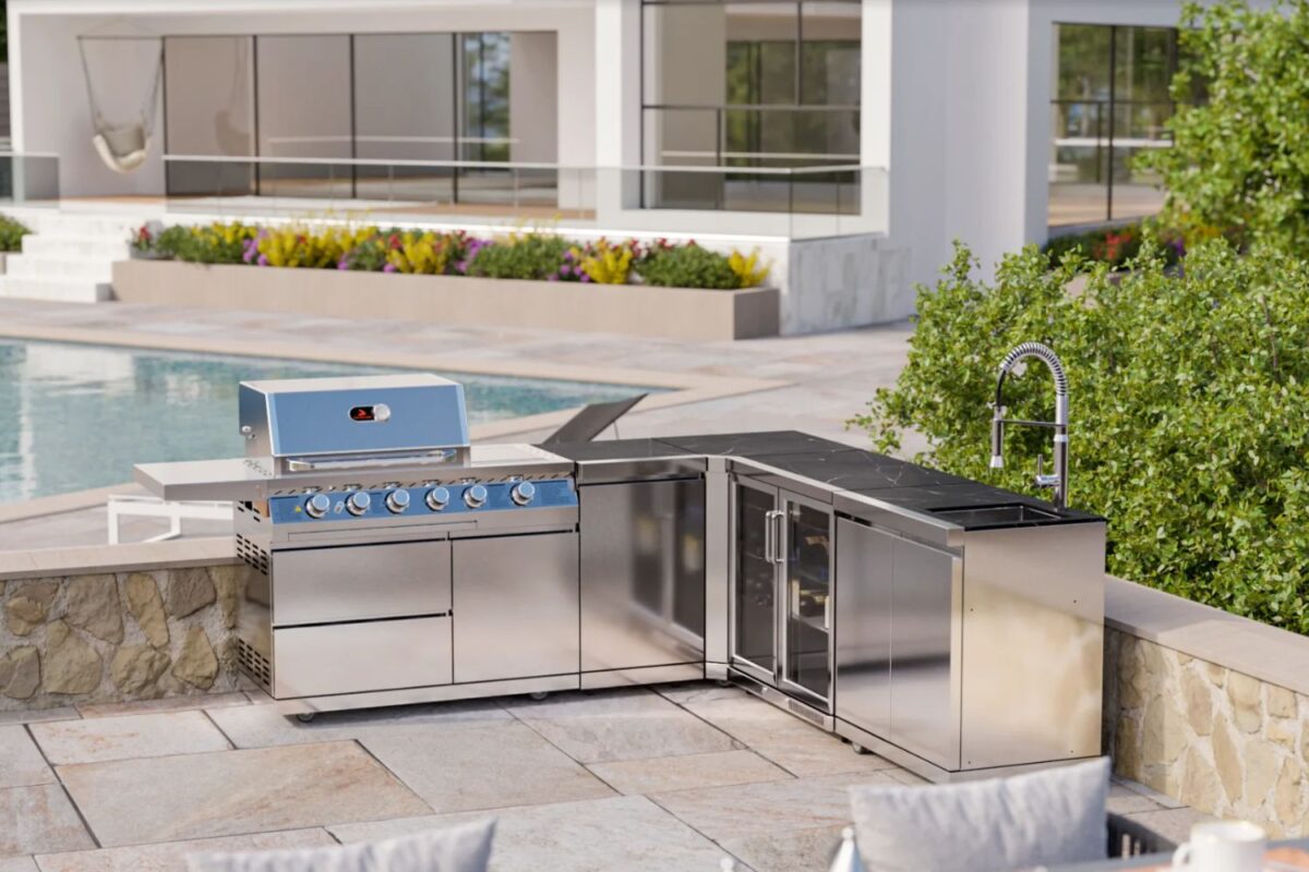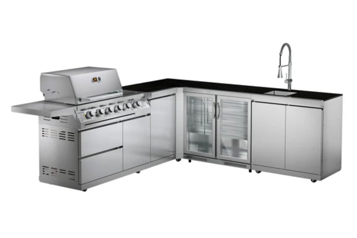 Whistler The Marlborough 4-Burner Outdoor Kitchen is a stunning L-Shaped Outdoor Kitchen with black Laminam worktops – a beautiful design to finish any home garden space. The large BBQ and integrated kitchen area brings self-catering to your outdoor space.