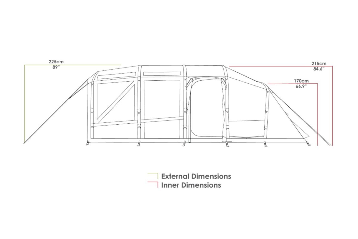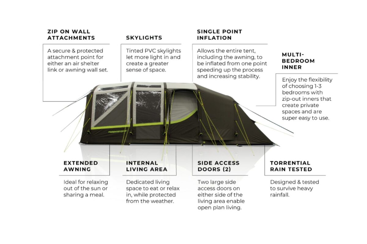 - Single Point Inflation – allows the entire tent, including the awning, to be inflated from one point speeding up the process and increasing stability.