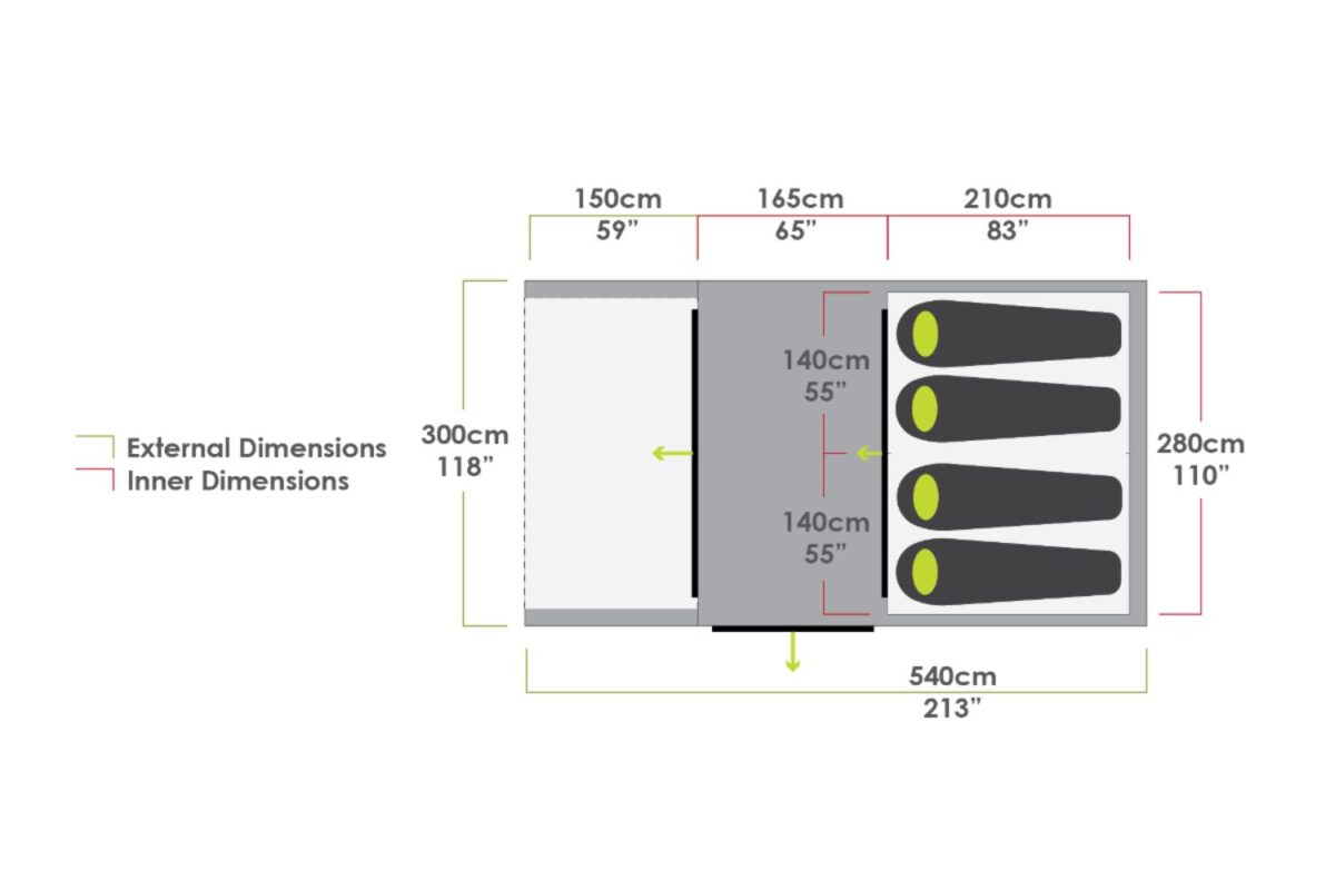 - Extended awning – Creates private and protected space at the front of the tent, ideal for relaxing out of the sun or sharing a meal.